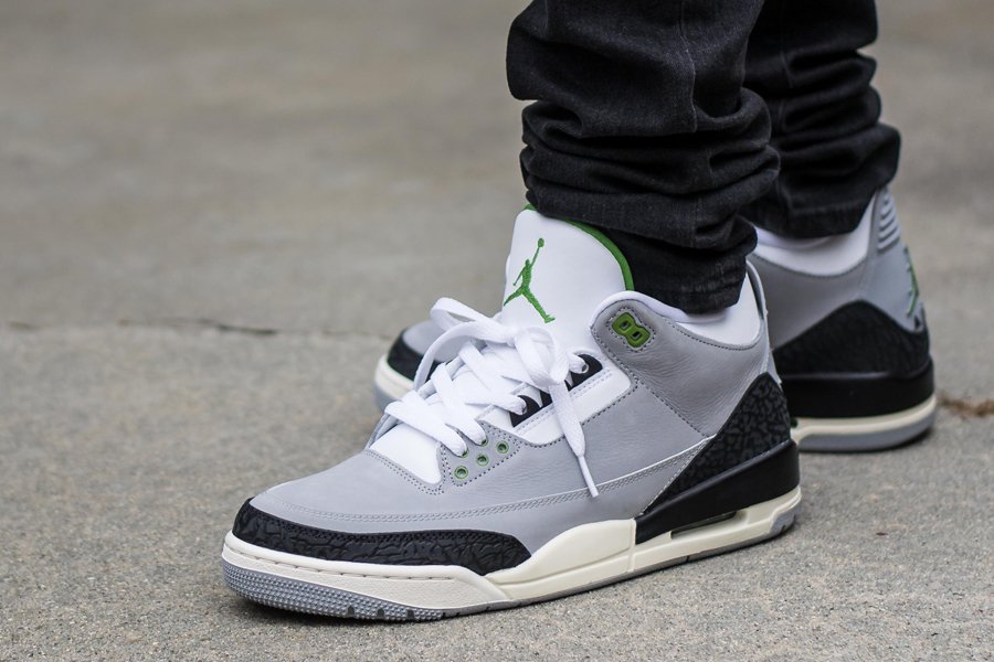 Part of a four-shoe “Nike Icons” Collection paying homage to some of Tinker Hatfield’s greatest non-Jordan designs, the “Chlorophyll” 3 draws cues from the Nike Air Trainer 1 in a colorway famously linked to tennis legend John McEnroe. The shoe features a mix of light and dark grey, white and black throughout. Light green accents hit the ‘Nike Air’ heel logo, tongue Jumpman branding and eyelets.