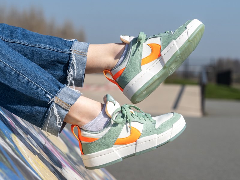The Nike Dunk Low Disrupt “Sea Glass Crimson” carries on the legacy of the ‘80s hoops shoe with a pastel palette and refreshed build. The upper is constructed from off-white textile with pale green leather overlays and an oversized orange Swoosh. The same citrus hue is applied to an added pull tab at the heel, while a standard Nike tag adorns a plush exposed-foam tongue. The low-top is mounted on a segmented platform midsole, reinforced by a translucent green rubber outsole.