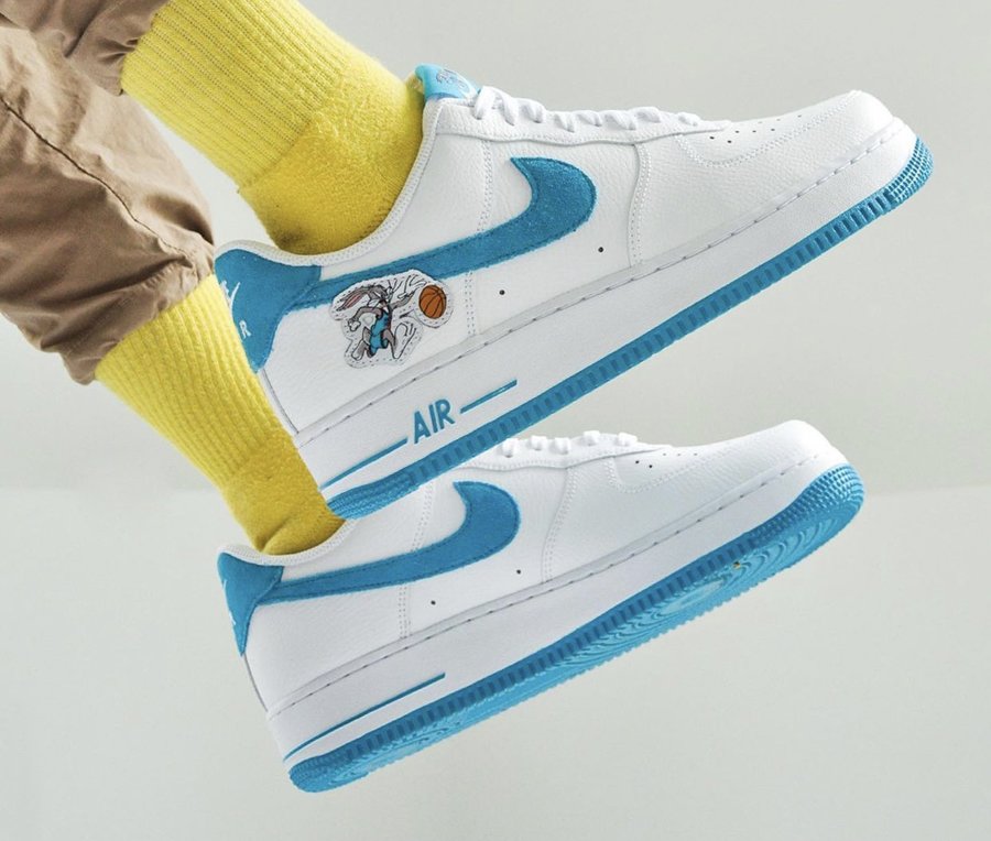 The Nike Air Force 1 Low “Hare” which is inspired by both Bugs and Lola Bunny. This Nike Air Force 1 Low starts off with a White leather construction all over the upper with Light Blue Fury detailing landing on the Swooshes, heel tabs, tongue tags, insoles, the “AIR” on the midsoles, and the rubber outsoles. The highlight of this Uptown is the addition of Bugs and Lola Bunny in the Tune Squad jerseys on the tongue tags and the lateral ankles.