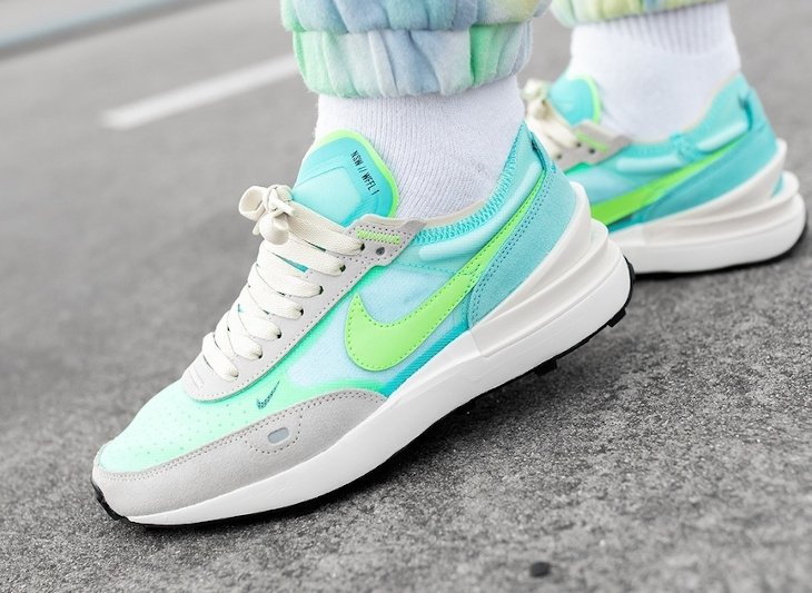 We’ve got the success of the Nike x sacai collaboration to thank for the revival of the iconic Waffle One silhouette. For this latest iteration, you’ll find a sleek transparent mesh in a bright green and Aqua, which ties in nicely with the pastel green Nike Swoosh on top. That iconic Waffle midsole comes stacked in cream, and paired with a black outsole that’s updated with moulded lugs, for traction and support. Suede overlays continue this premium aesthetic, while the neutral laces follow suit.