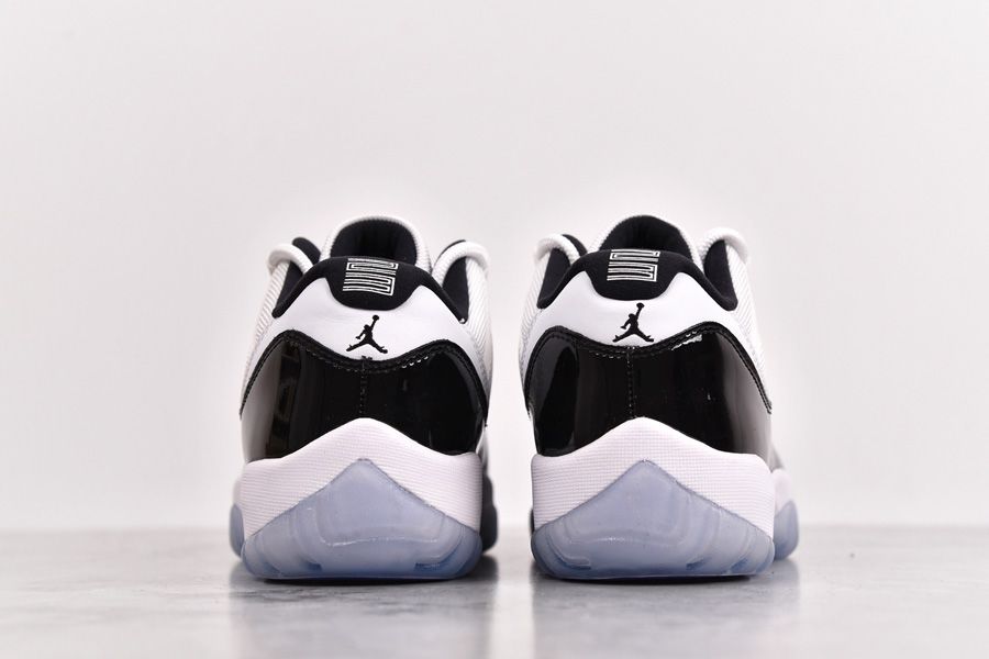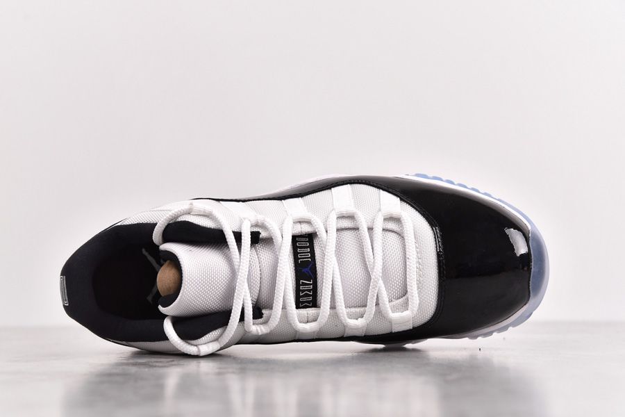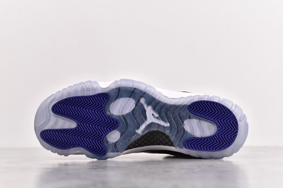 The Air Jordan 11 Concord, famously worn by Michael Jordan in the Bulls’ 1996 championship parade, features the expected white Cordura and leather upper, black patent overlay, concord Jumpman branding and blue-tinted translucent outsole.