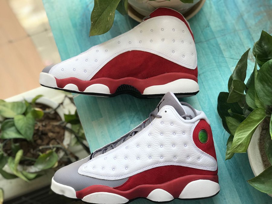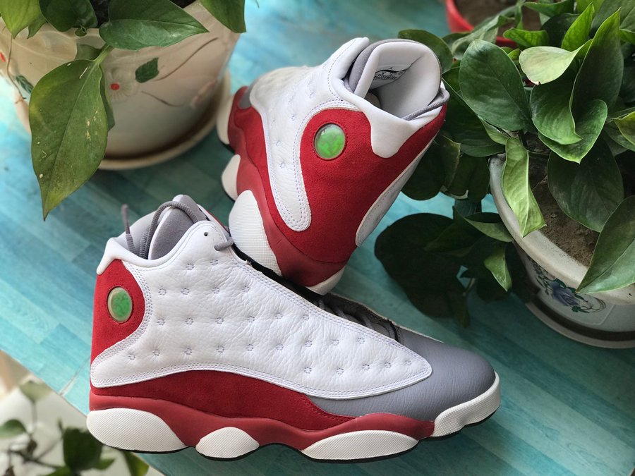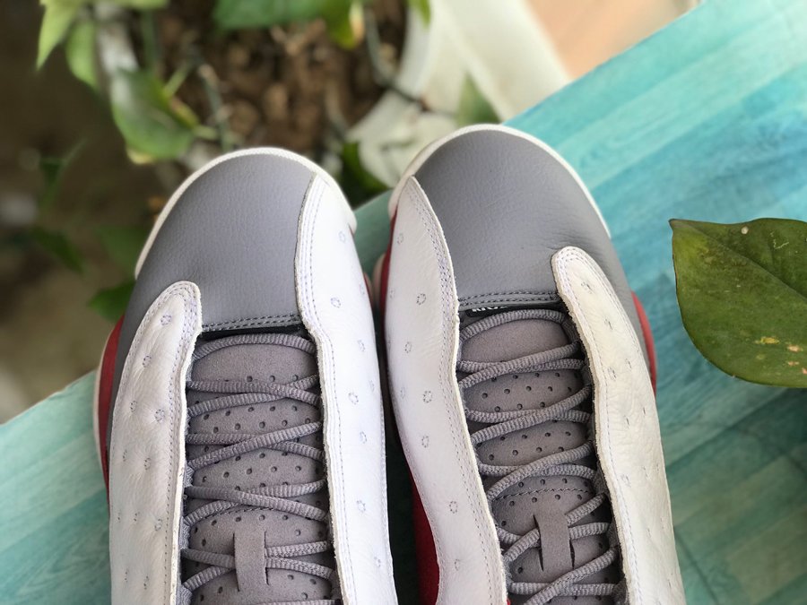 The budding Jordans boast slightly more nostalgic appeal due to its aesthetic alley-oop from the “Flints.” With a predominately white base offset by red suede paneling, the customary hologram remains perched in its standard position serving as the shoes branding. Flint Grey works the toe and leads up to the tongue finishing the look.