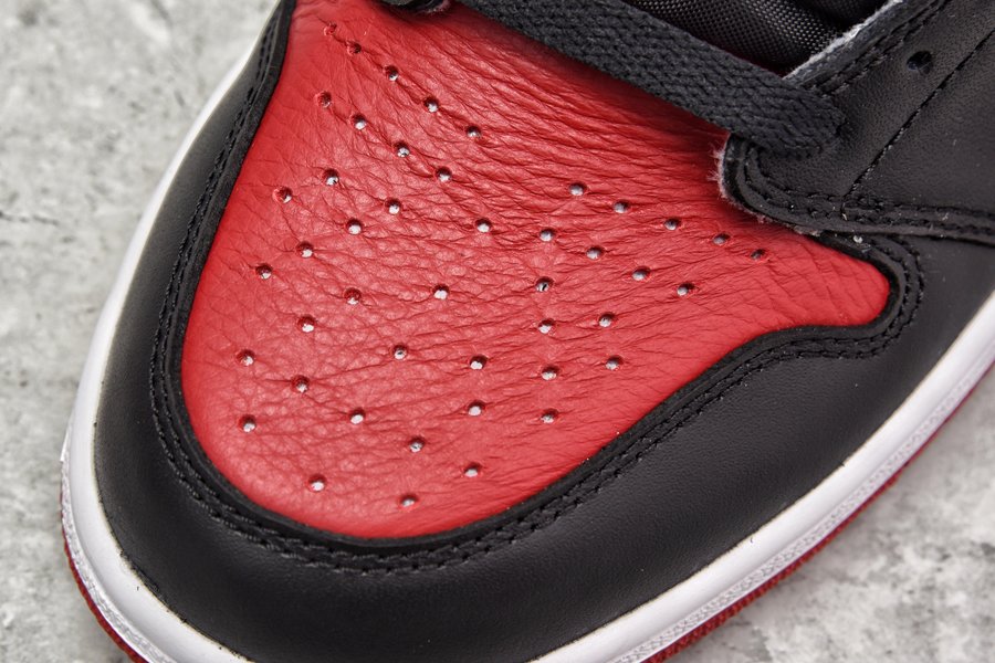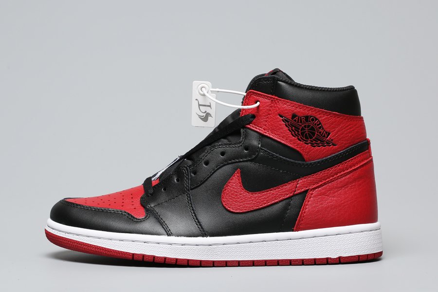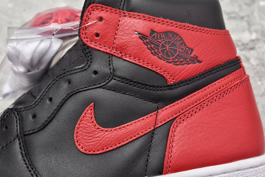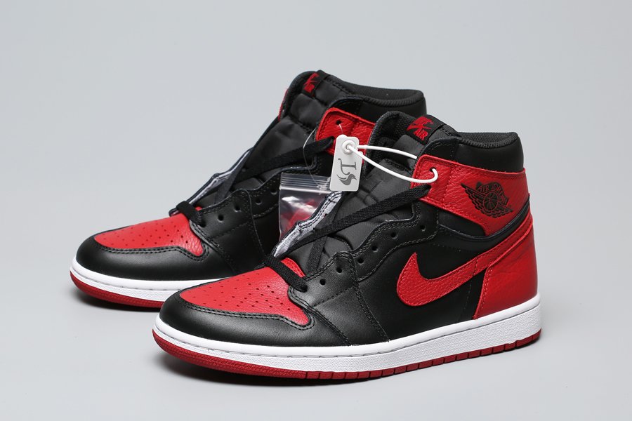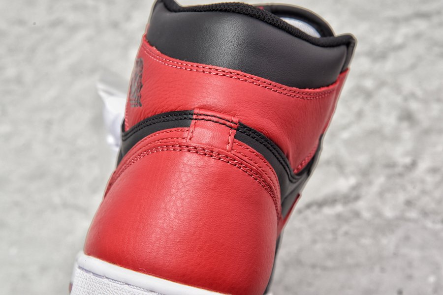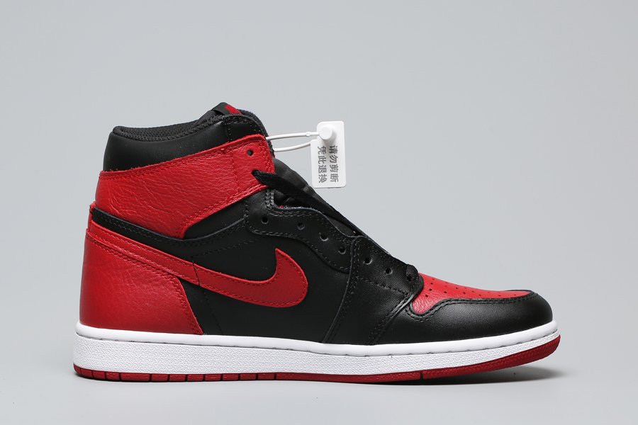 This Air Jordan 1 receives the traditional “Banned” aka “Bred” color scheme of Black and Red that’s built with a full premium leather upper and rests atop a clean White midsole and Red rubber outsole. Some of the notable features to this release includes ‘Nike Air’ branding on the tongue and will not include the ‘X’ detailing on the heel that was seen on the original “Banned” release from 2011.
