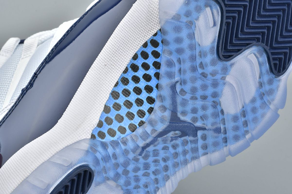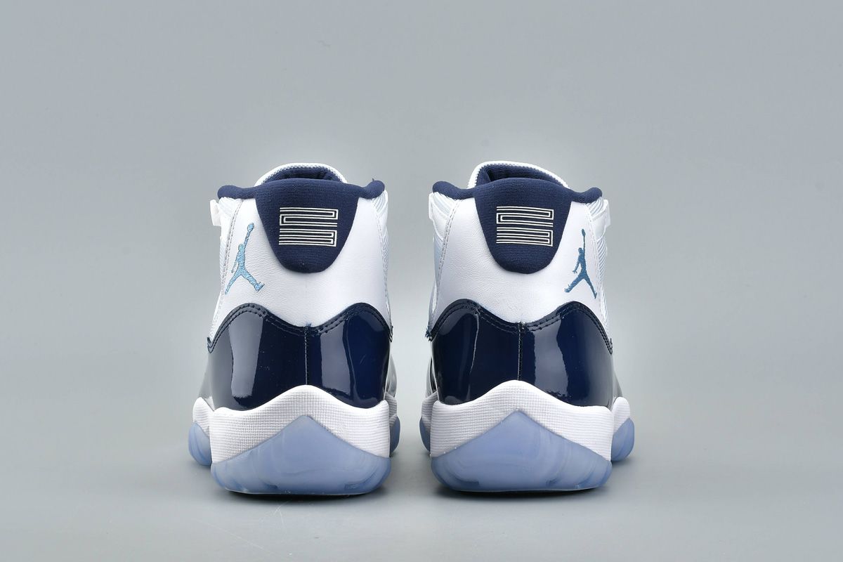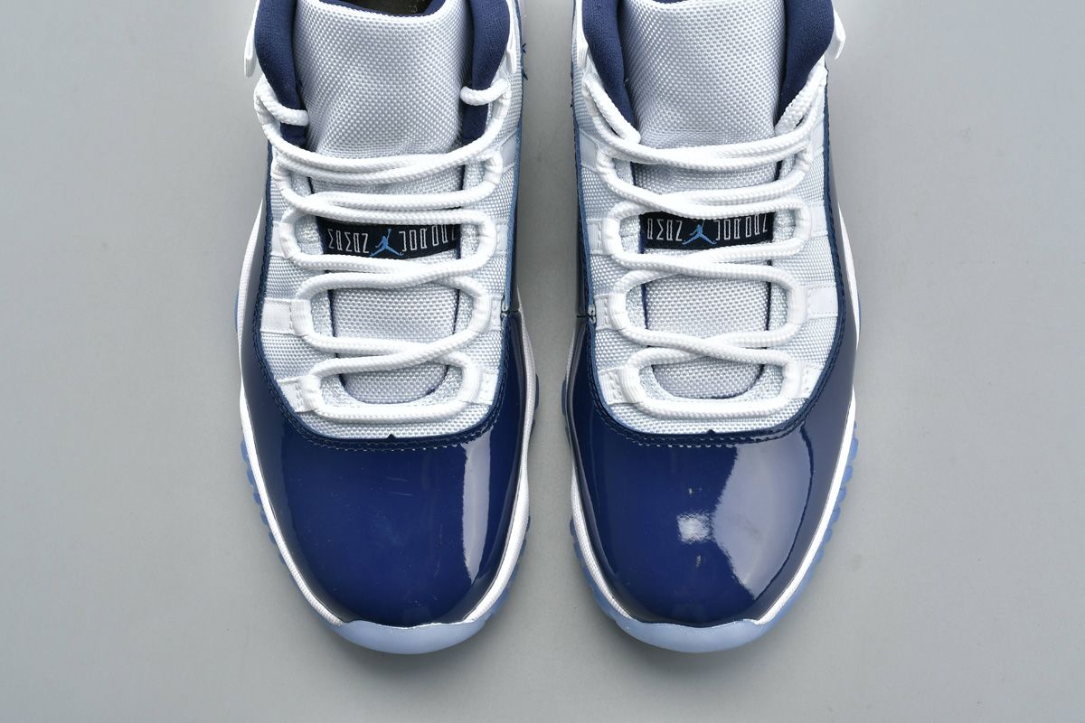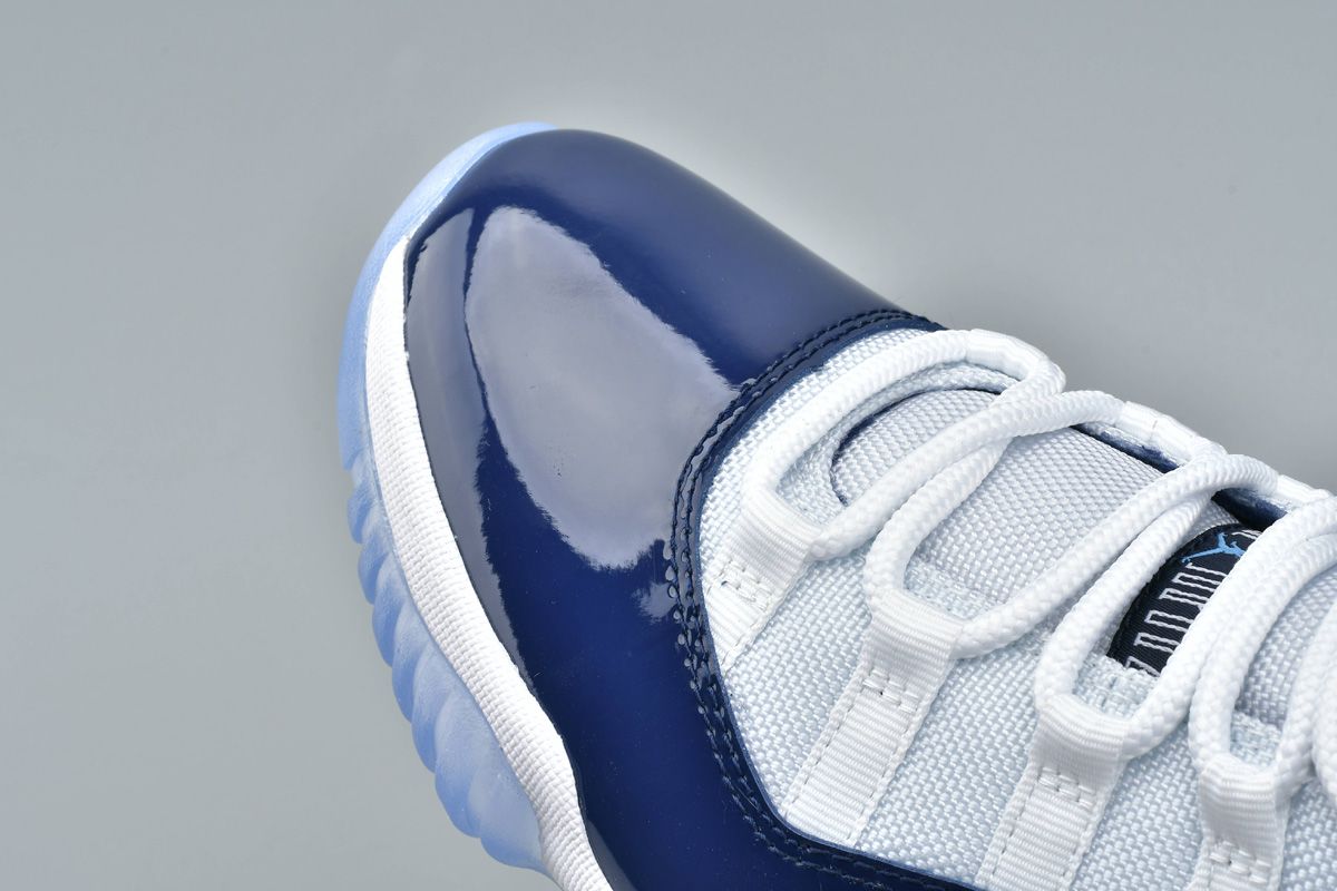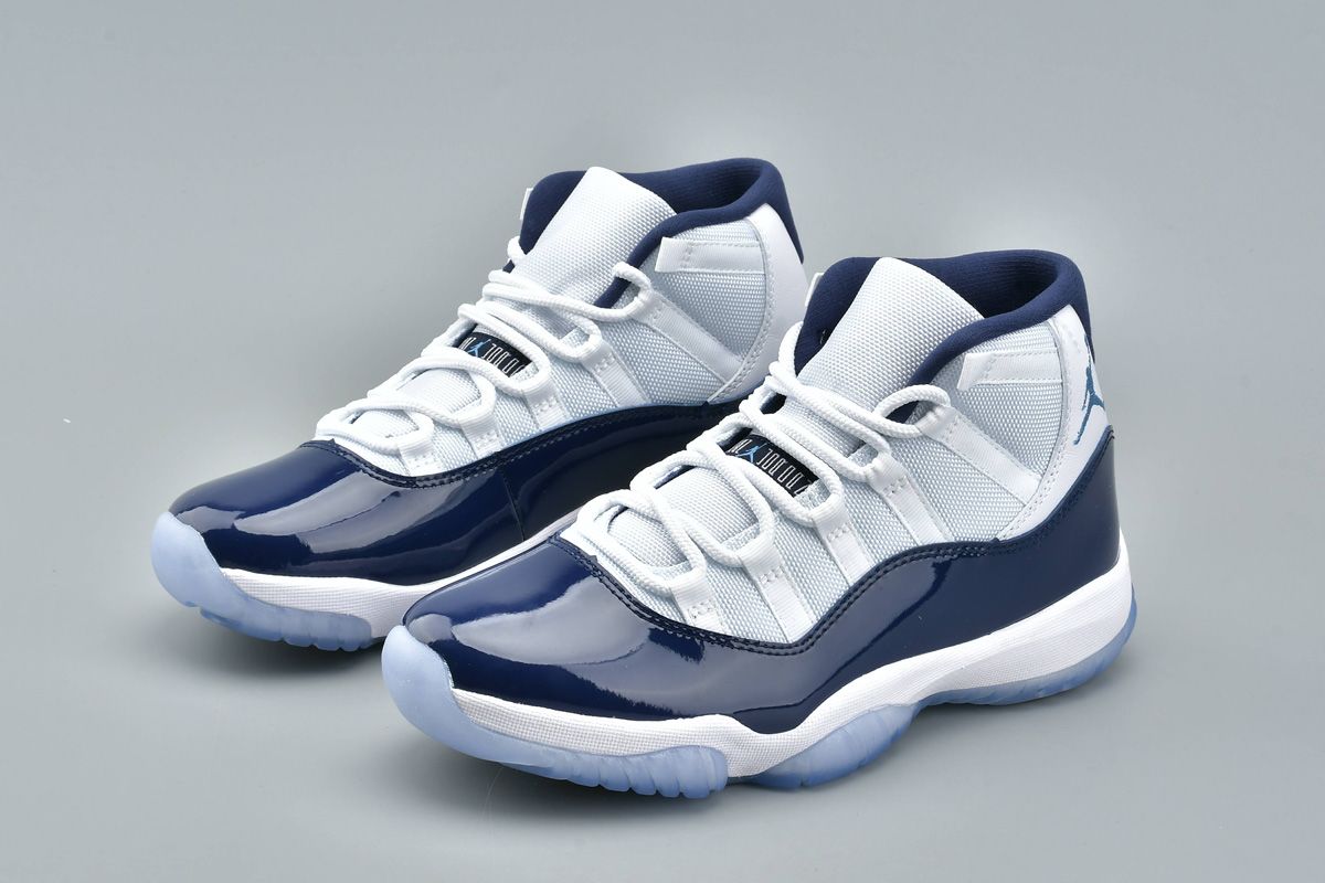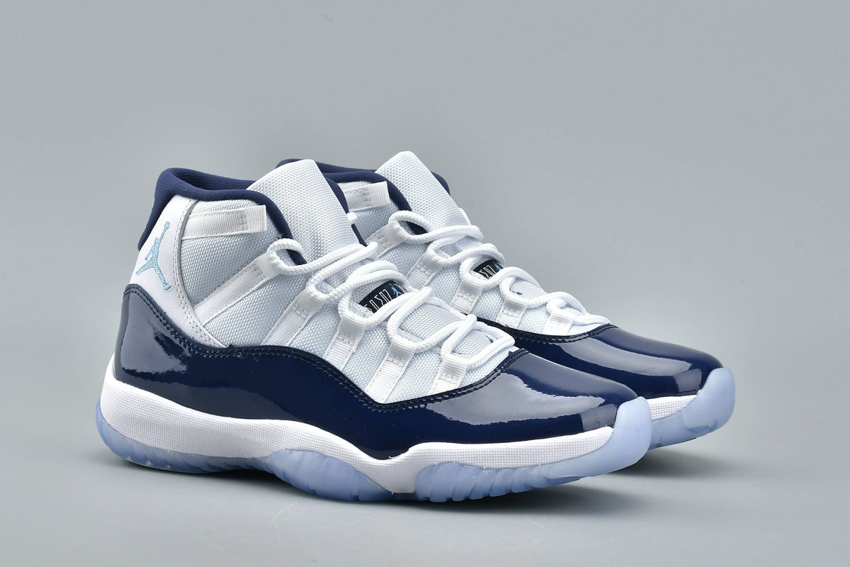 Patent leather mudguard hits midnight navy and the ankle has mini blue Jumpman embroidered. Clean white midsole and an icy blue outsole finish off the look.