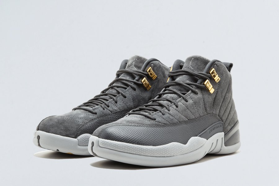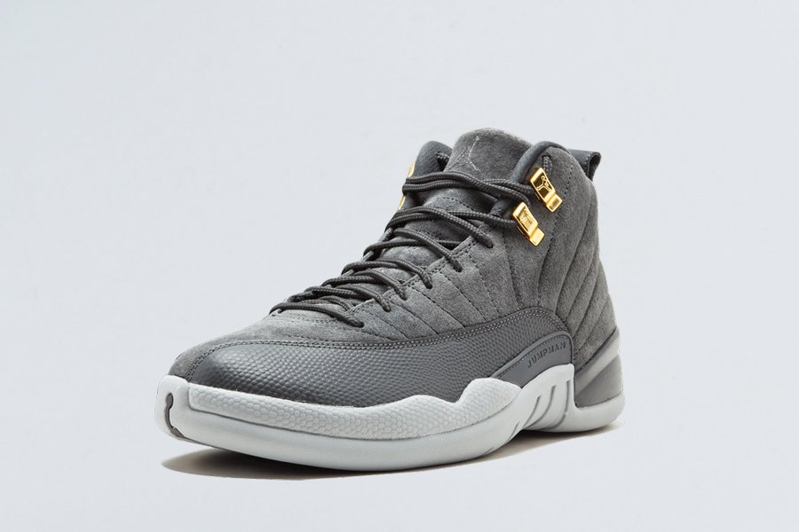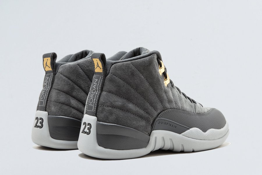 Featuring a Dark Grey suede upper with a matching textile overlay. Tonal Jumpman branding appears on the tongue, along with Metallic Gold upper eyelets originally made famous on the “Taxi” Air Jordan 12s. Completing the design is a lighter shade of Grey on the outsoles with hits of Tan on the back pull tabs and right below the Jumpman of the outsole.