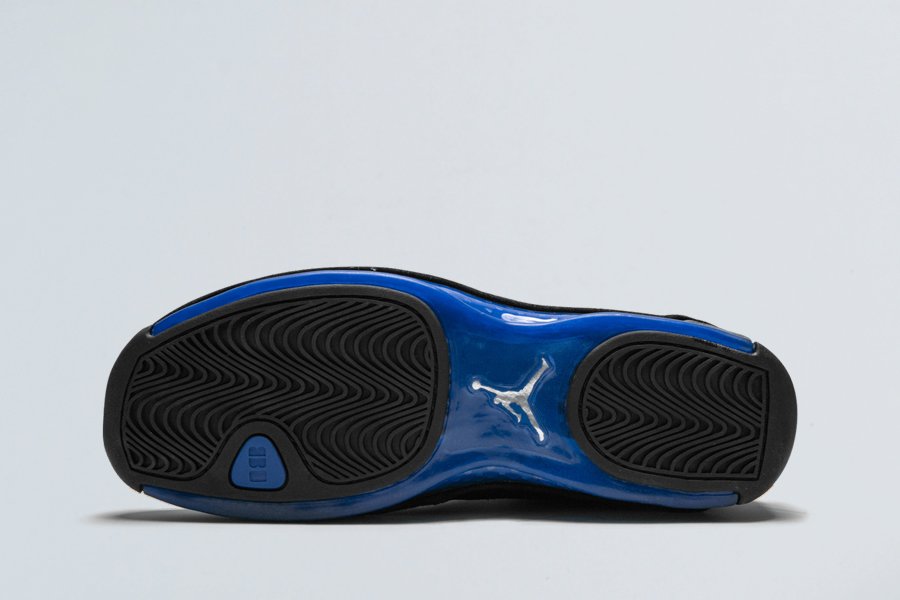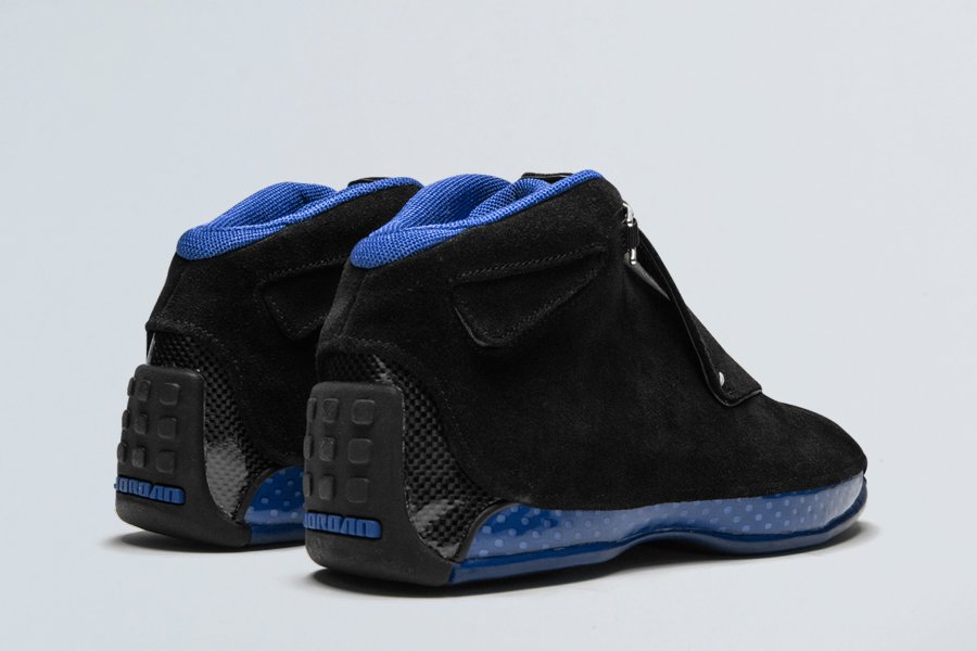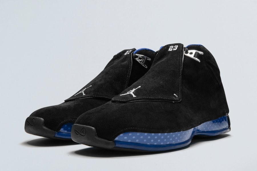 Featuring the same OG colorway as a nod to the Washington Wizards, the sneaker is made of black suede across its upper with a removable shroud to hide its tongue and laces. The sneaker is contrasted with metallic silver upper eyelets and royal blue for the lining and trimming. Final details include flaps on the ankle inspired by the air vents of the Lamborghini Murcielago, while a blue midsole and black rubber sole completes the design.