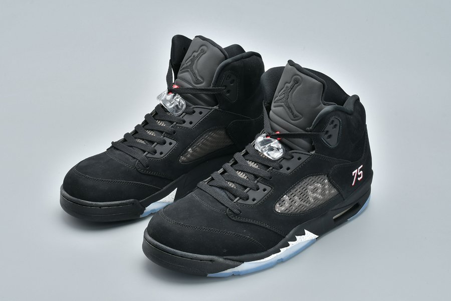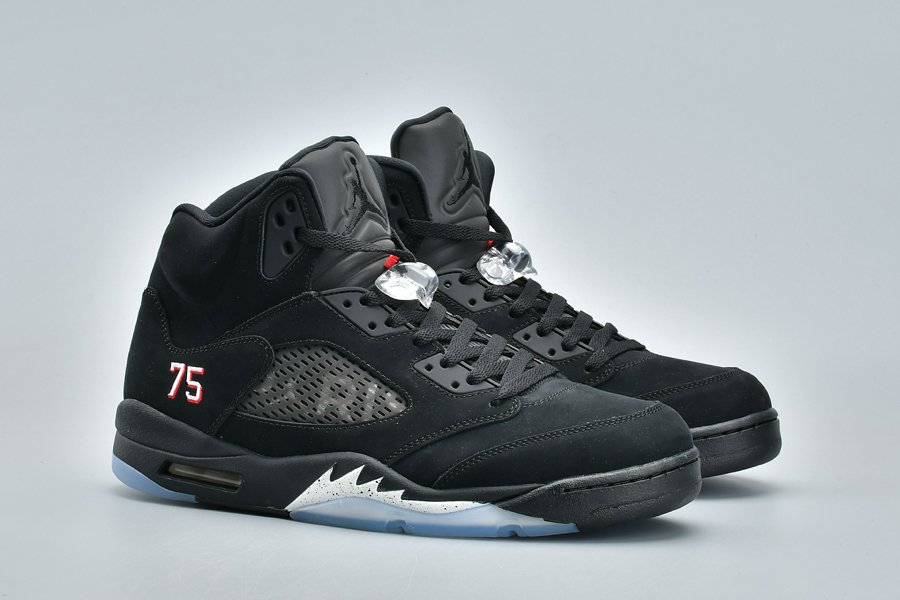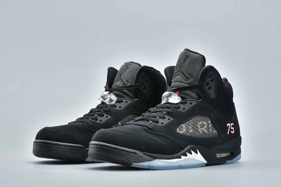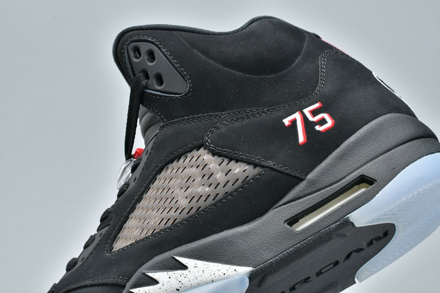 This Air Jordan 5 ‘Paris Saint-Germain’ features Paris text across the netting and the number 75 stitched by the heel which references Paris’ zip code. Other details includes a full Black upper while an icy translucent outsole completes the look.