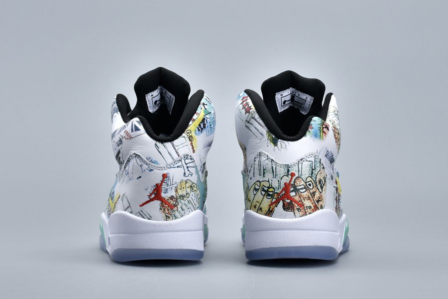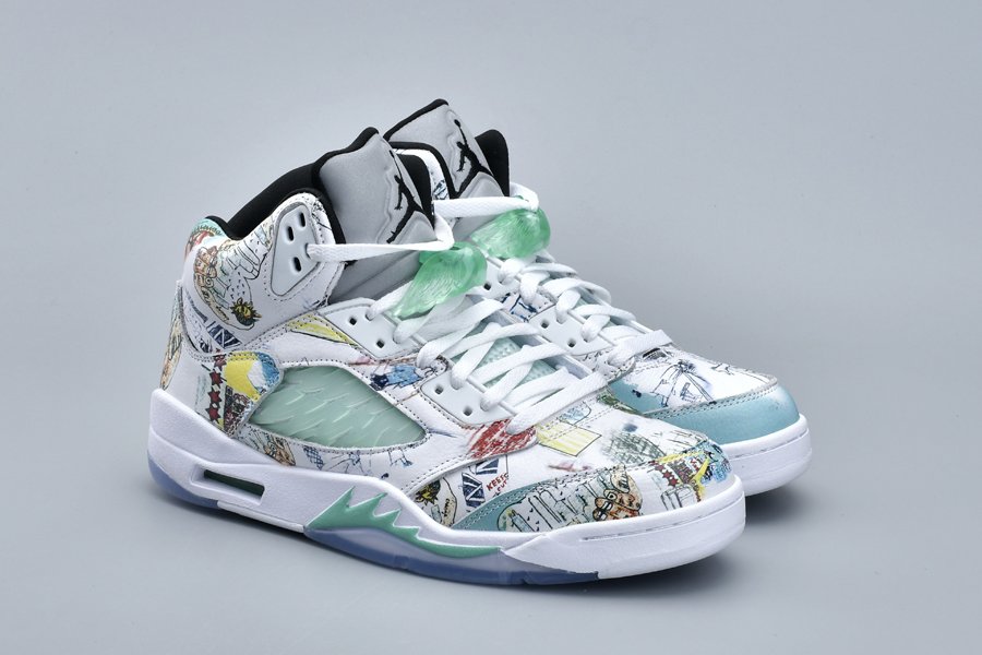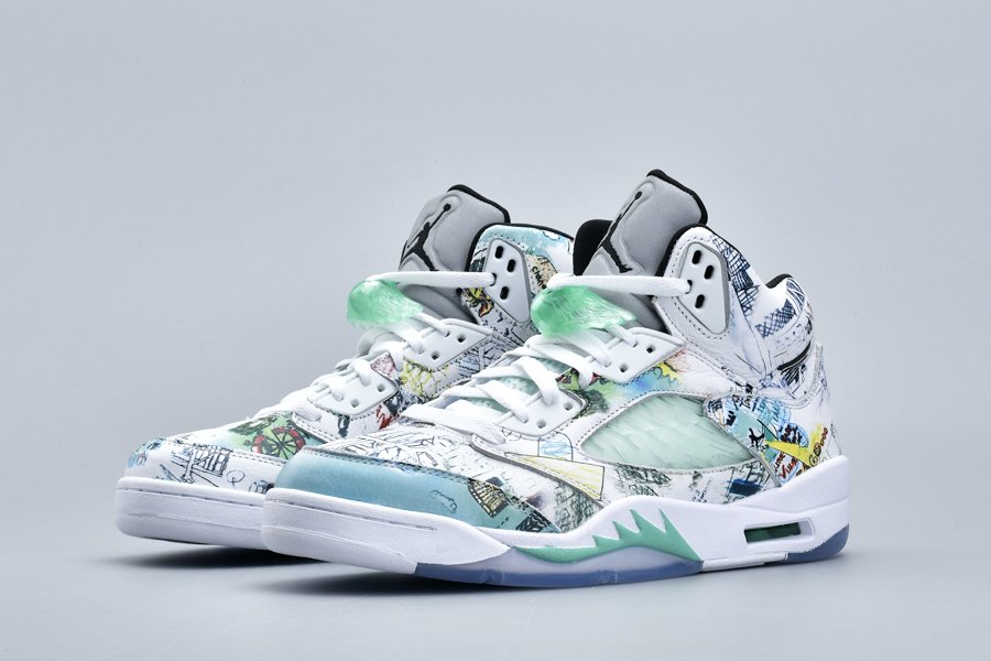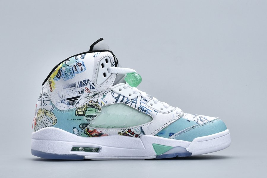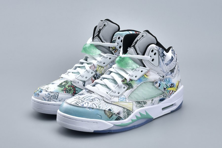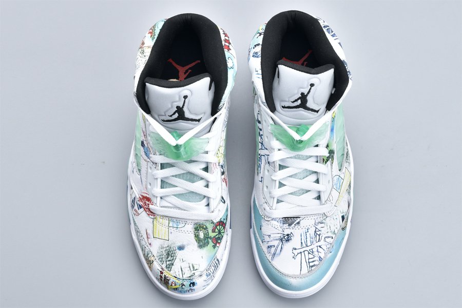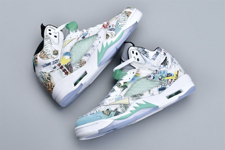 The Air Jordan 5 Wings is a new style releasing this year, and this special iteration employs the power of education to help the youth unlock greatness. Featuring a white leather upper, the sneaker is highlighted with an all-over sketched design of graphics throughout in multiple colors, and rumors report that each pair will come with different graphics on each shoe. Finishing touches consist of a lacelock shaped as Wings, Jumpman branding on the heel, the classic Air Jordan 5 netting in the side panels comes shaped as wings on this iteration as the model, Wings label on the inside of the tongue, three sets of laces and finally an icy translucent sole.