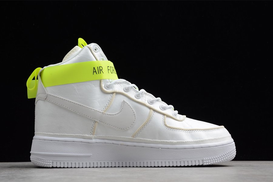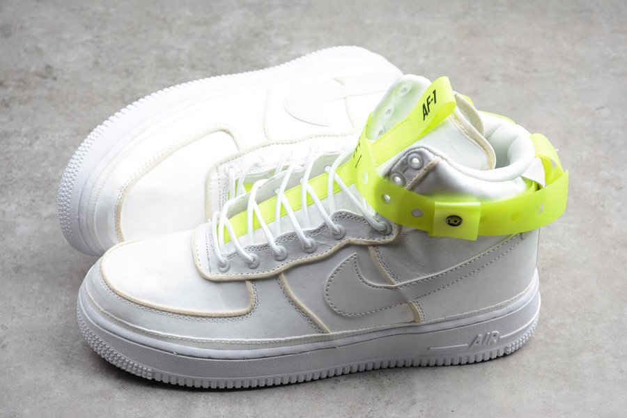 The standout detail of the shoe is the neon yellow Air Force 1 ankle strap, which is designed to look like VIP wristbands given out in nightclubs. The strap is made from the same material — Tyvek — as these wristbands, and even features a snap-hole fastening system.
