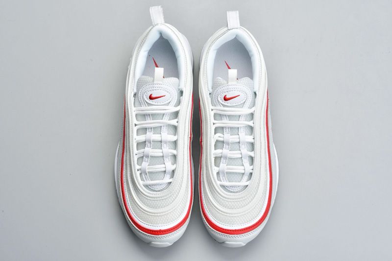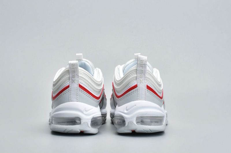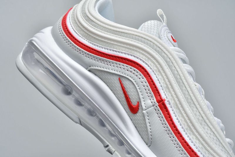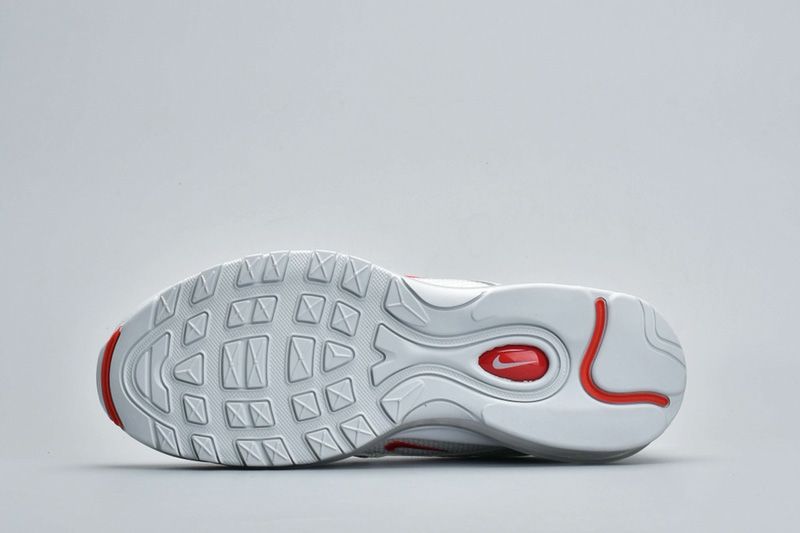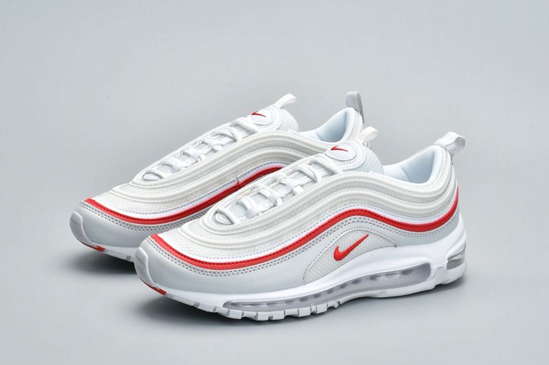 A sleek combination of red, white, and grey. A varsity-style red stripe runs around the length of the white mesh upper, adding a striking touch to what’s otherwise a fairly toned-down colorway, while a grey mudguard offers a light contrast between the stark white and the flashy red. Small red swooshes arrive on the tongue and midfoot, and the shoe is completed by a white midsole, grey Air Max unit, and grey outsole.
