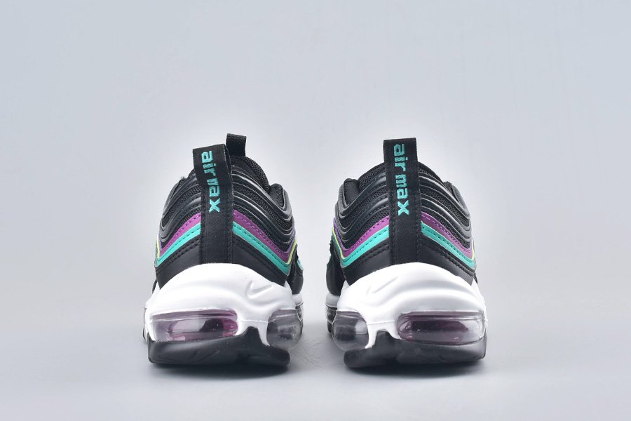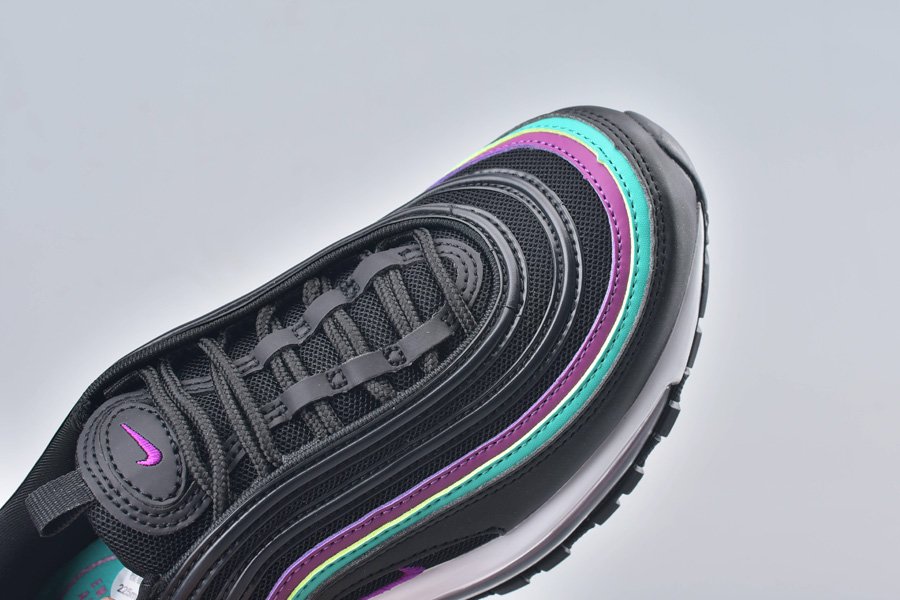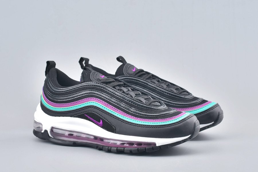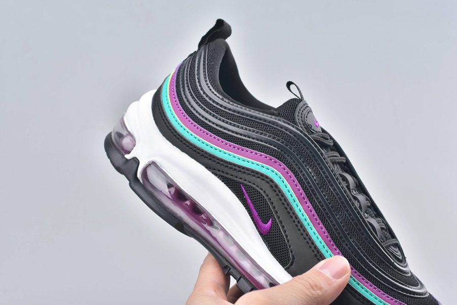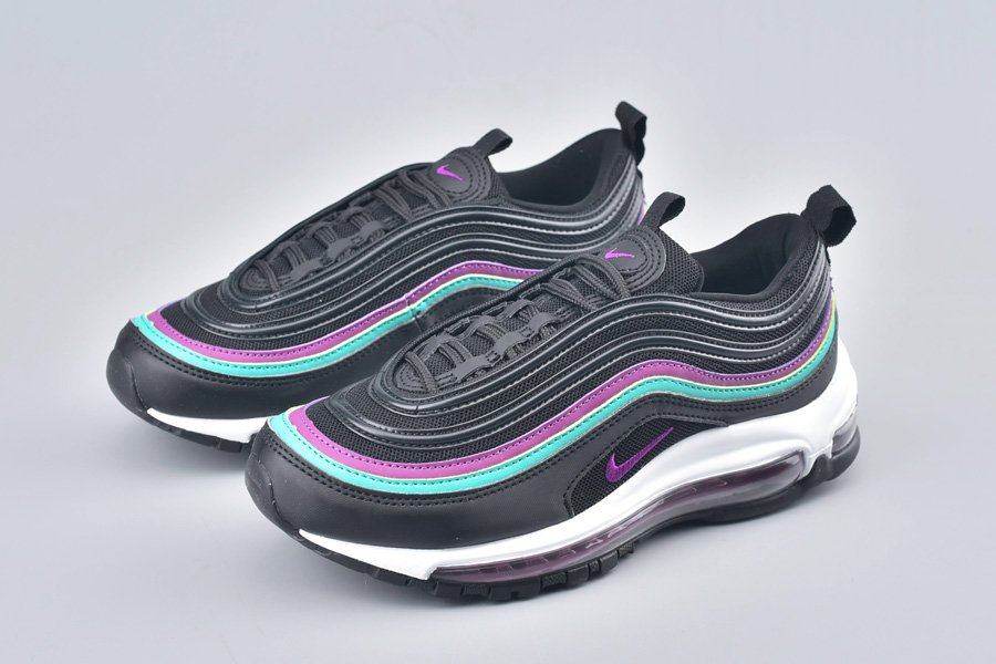 The women’s Nike Air Max 97 Black Grape comes dressed in a Black, Bright Grape, and Clear Emerald color scheme. The upper is constructed out of mesh and leather. The base is Black, while the Bright Grape, and Clear Emerald hits provide the shoe with the “Grape” aesthetic. Below you will find a White midsole and Black rubber outsole to complete the look of the shoe.