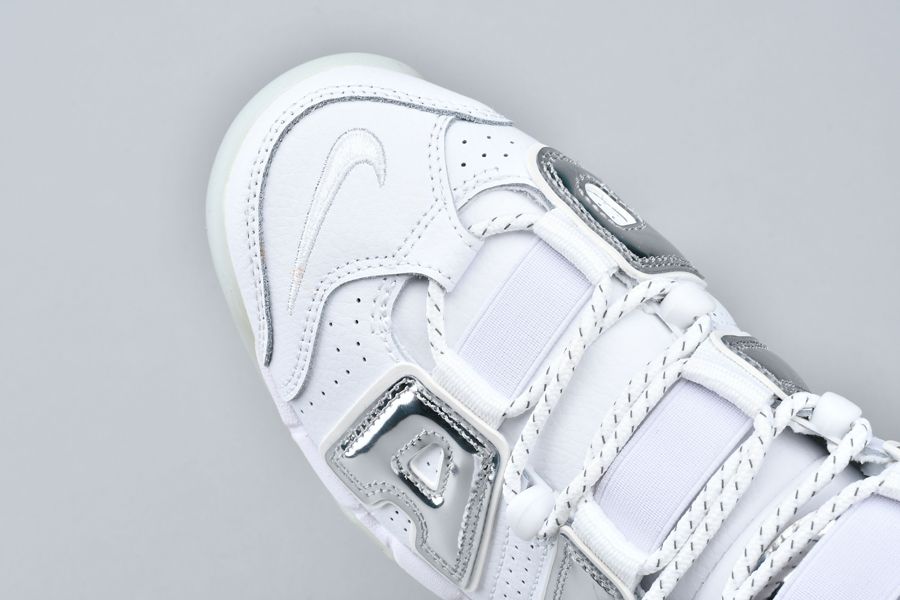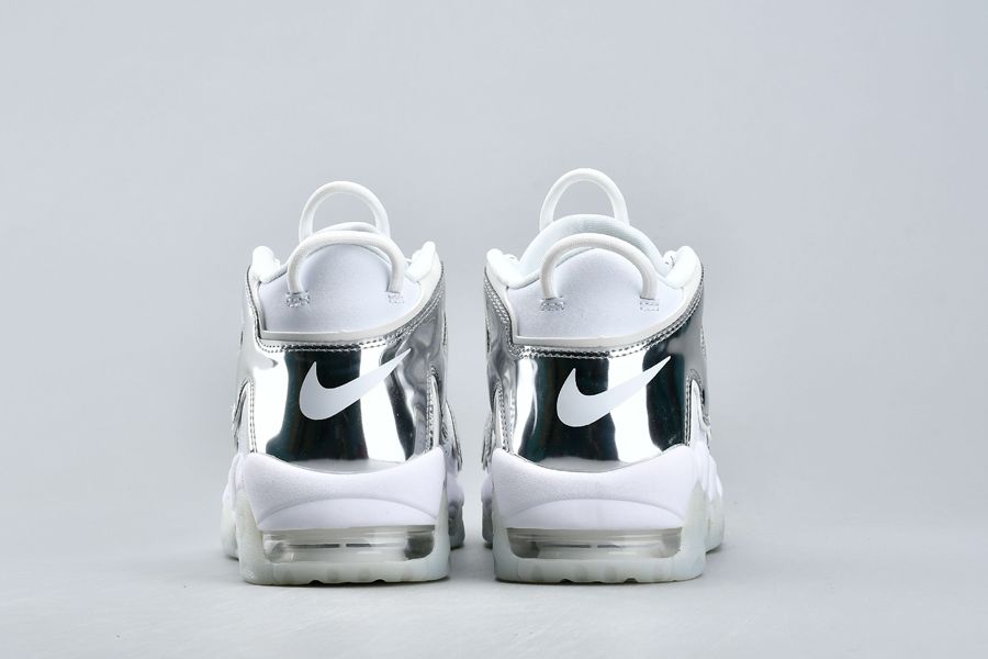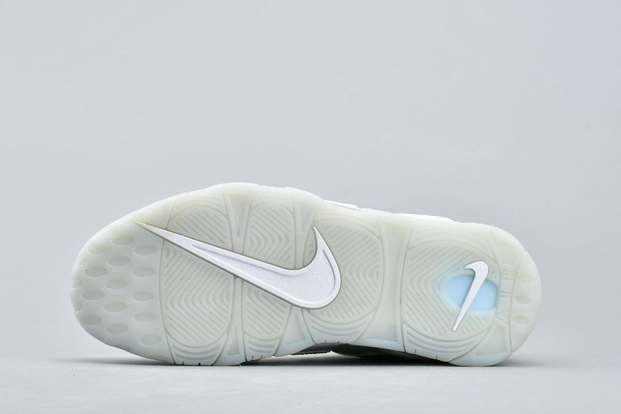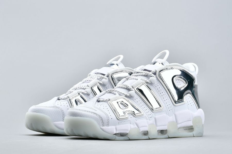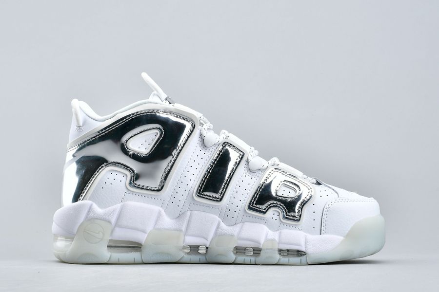 Dressed in a White, Chrome and Blue Tint color scheme. This Nike Uptempo features a White leather upper highlighted with a Chrome oversized “AIR” lettering on the sides. Perforated detailing and an icy translucent outsole completes the design.