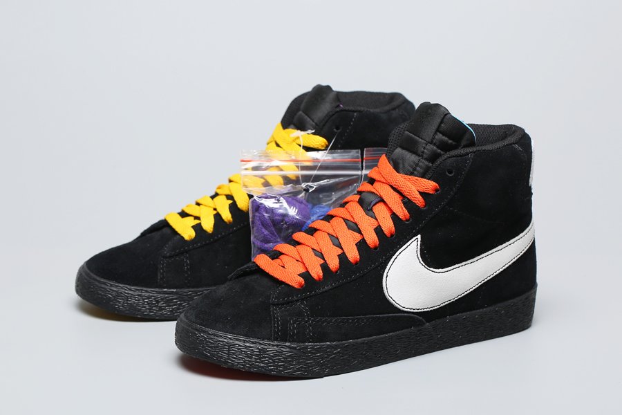 Featuring a black suede upper as the base, sail Swoosh branding surrounds the model, adding stitched “NY” and “LA” suede lettering on both left and right sides, respectively. Utilizing the color palettes from both the New York Knicks and Los Angeles Lakers, the left shoe is equipped orange laces with blue covering the tongue padding, while yellow laces and a purple tongue is applied to the opposite sneaker. Five sets of laces are included, allowing unique customization options.
