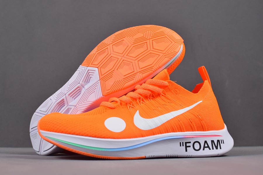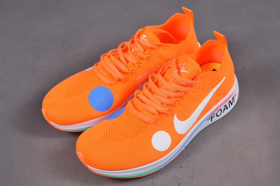 Dressed in total orange covering its Flyknit upper, the sneaker is also accented with accents of blue, white and volt dots to symbolize the striking zone areas for soccer players. Finally, a multicolored streak across the midsole with the signature OFF-WHITE “FOAM” branding on the heels completes the design altogether.
