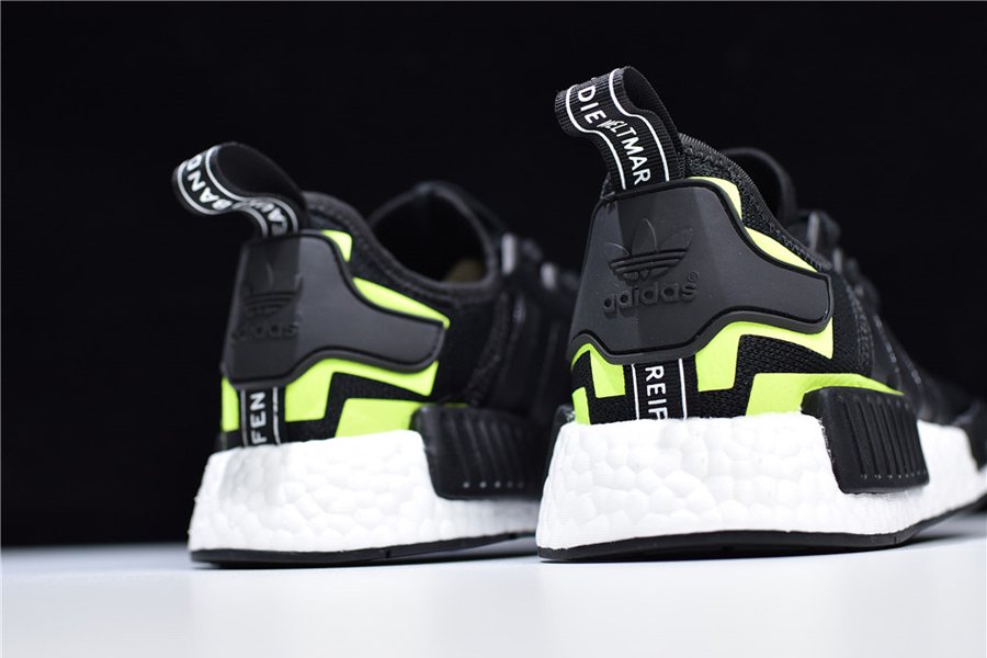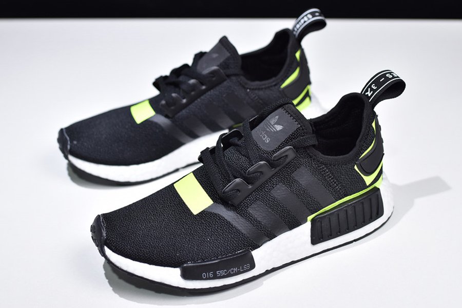 The adidas NMD R1 features Core Black across the knitted textile upper while also landing on the Three Stripes branding and NMD Pod overlays. In addition we have Volt on the seams and a few patches. Other details includes a White Boost midsole and Black rubber outsole.