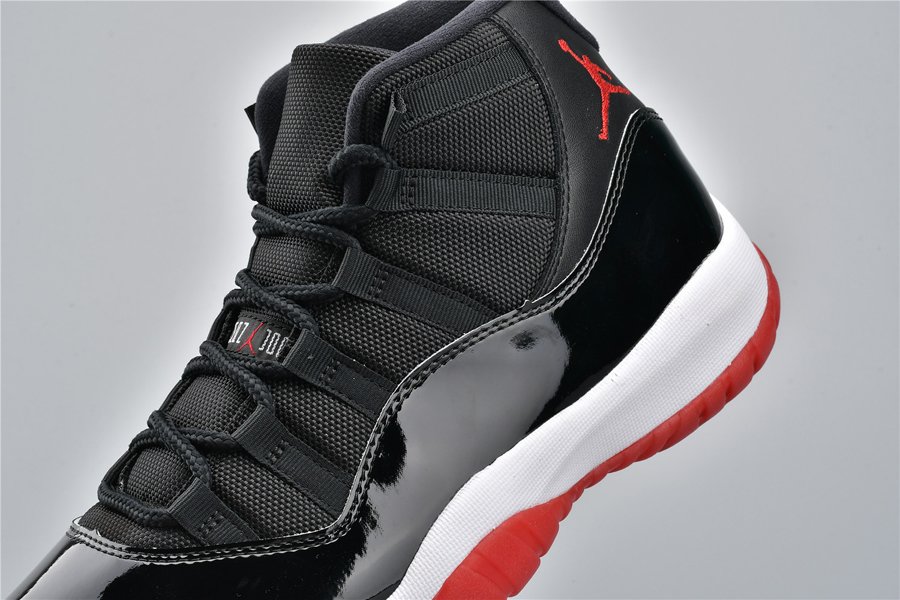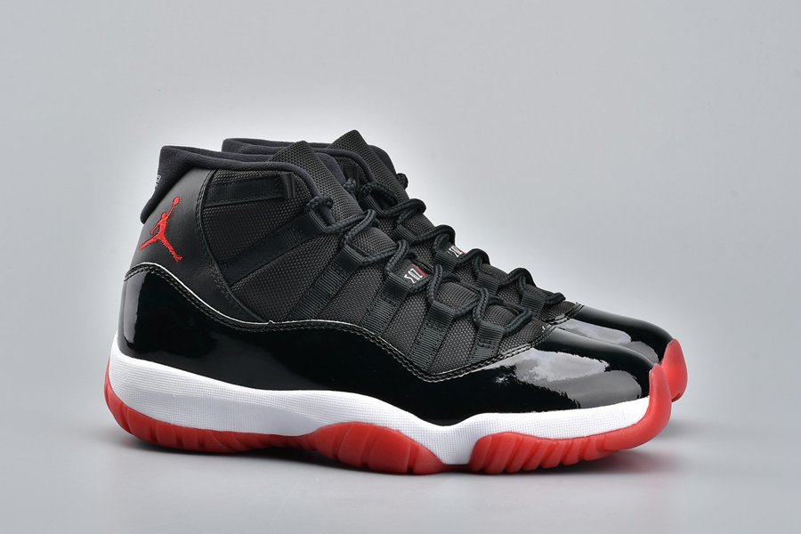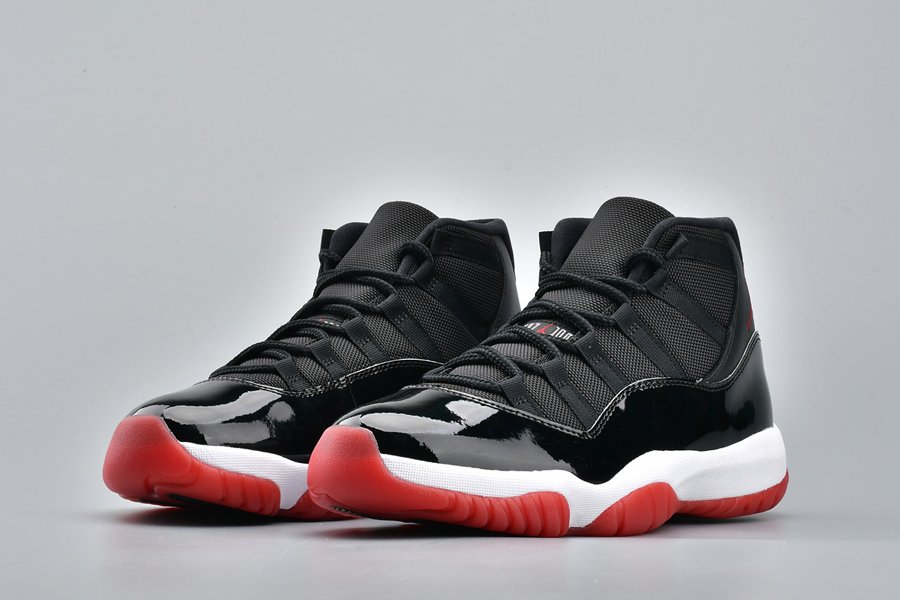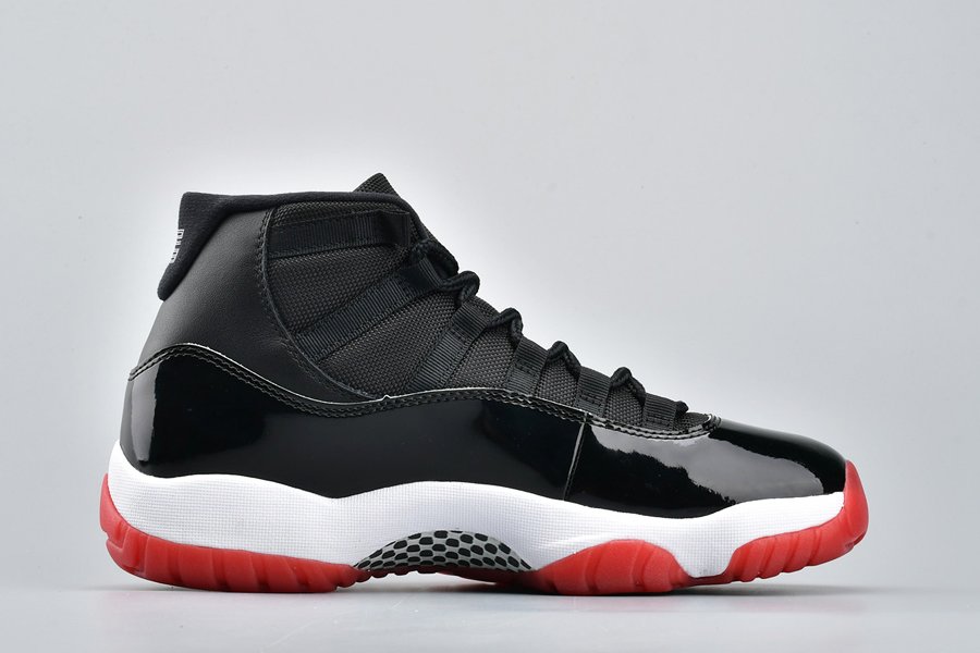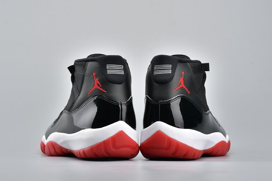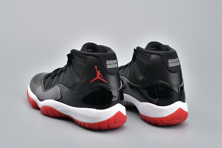 The Air Jordan 11 Bred sports a mixture of Black, White, and Varsity Red. The 2019 Air Jordan 11 “Bred” features the original high cut patent leather build and include the number 23 instead of 45 on the heels.