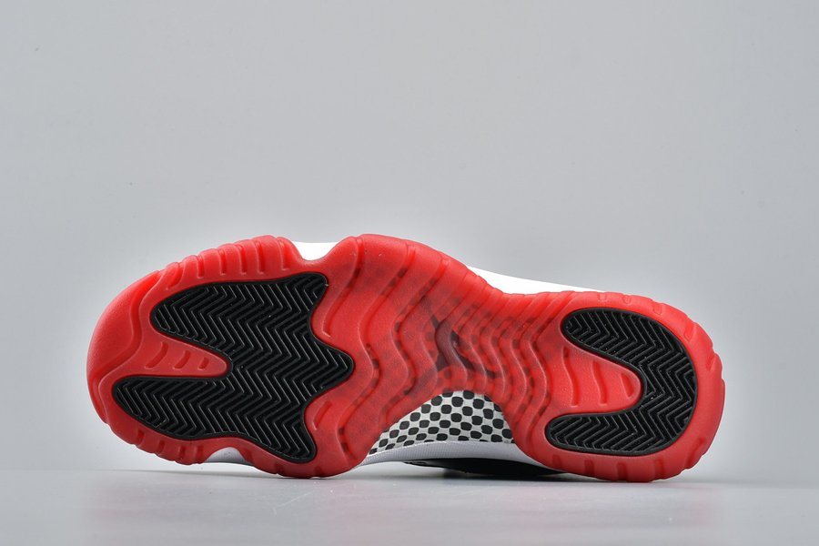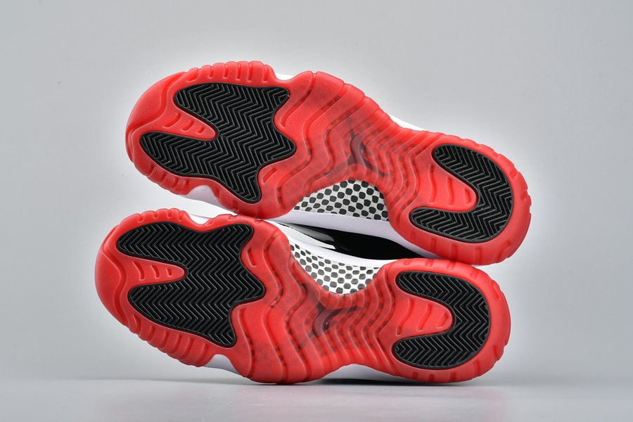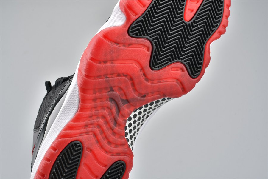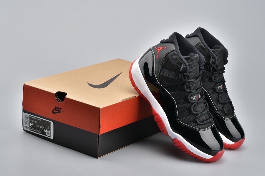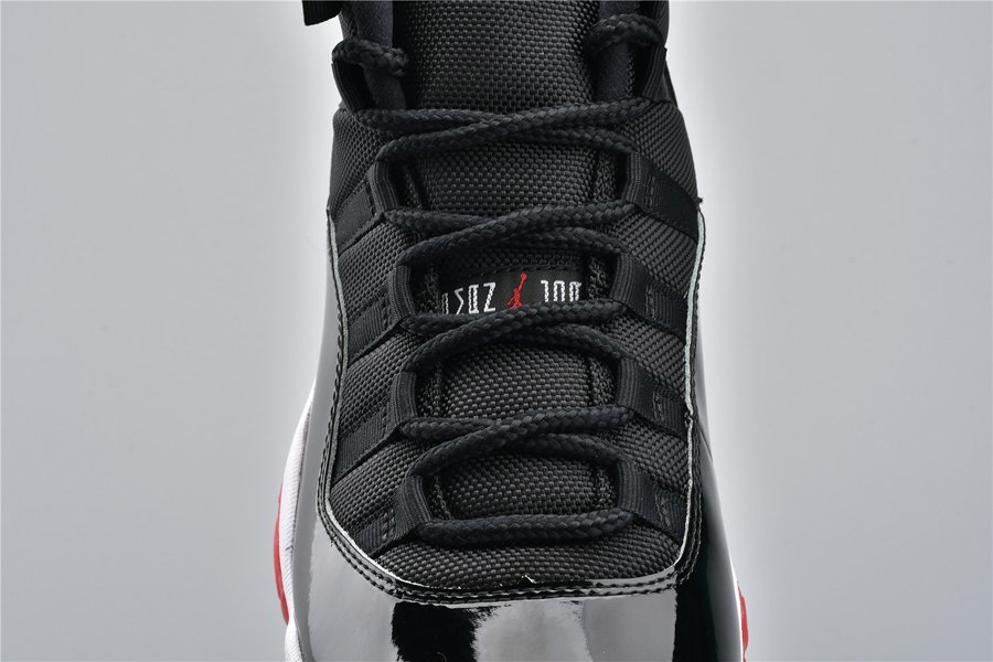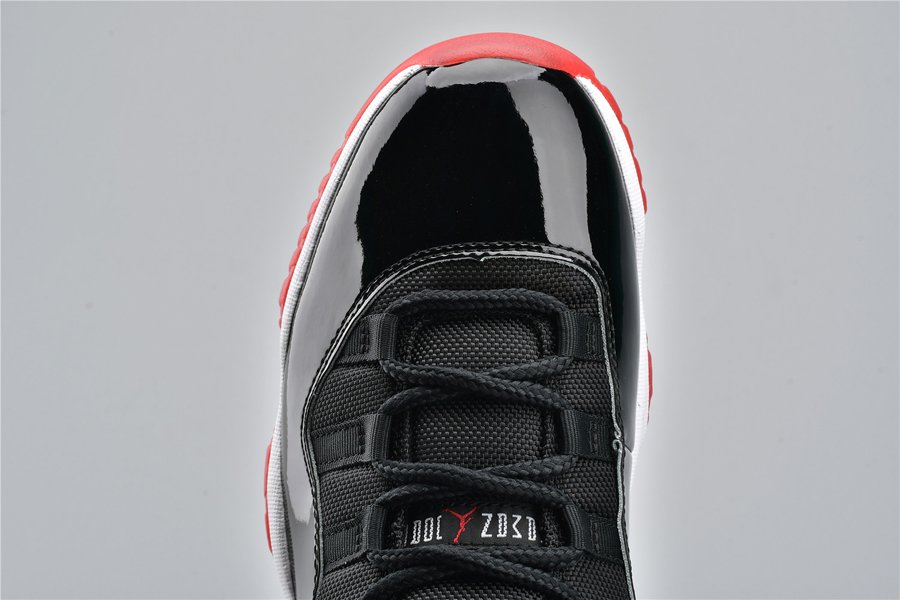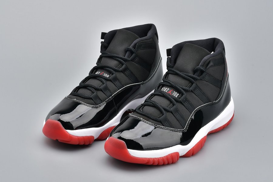 The Air Jordan 11 Bred sports a mixture of Black, White, and Varsity Red. The 2019 Air Jordan 11 “Bred” features the original high cut patent leather build and include the number 23 instead of 45 on the heels.