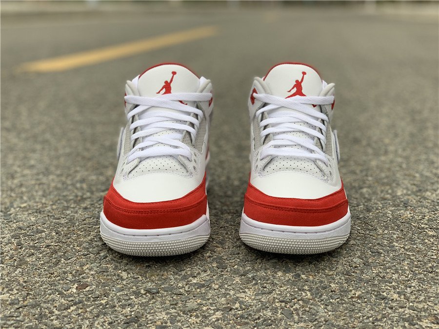 The Air Jordan 3 Tinker “Air Max 1” is an exclusive design that blends Tinker Hatfield’s OG Air Max 1 “University Red” and the Air Jordan 3 into one. Sporting white tumbled leather across its upper, the highlight red suede is placed on the mudguard, just like the Air Max 1 University Red, which replaces the traditional elephant print pattern. Completing the style are interchangeable swooshes, fire red “Nike Air” branding on the heel, a white midsole and grey outsole.