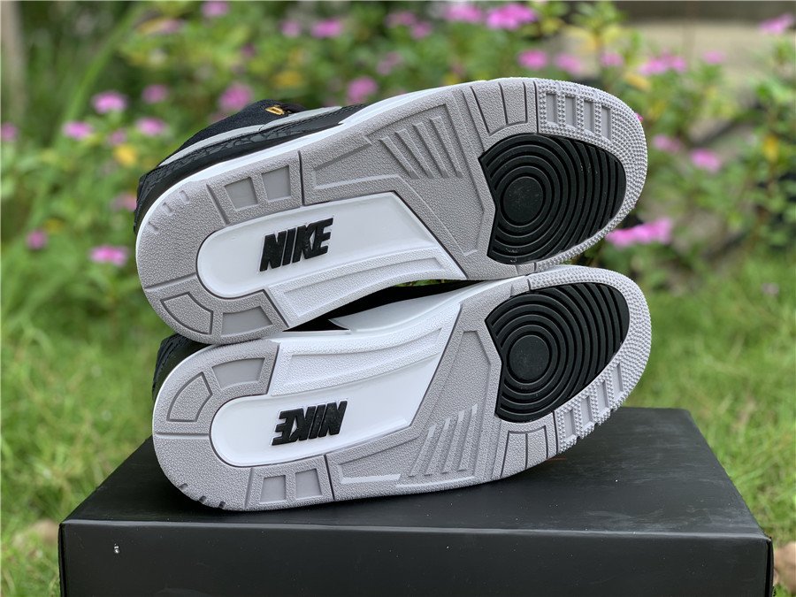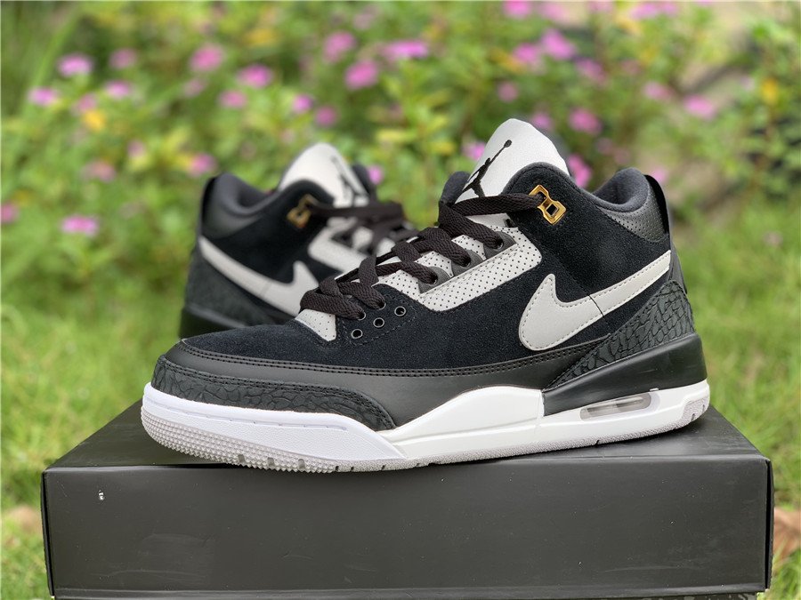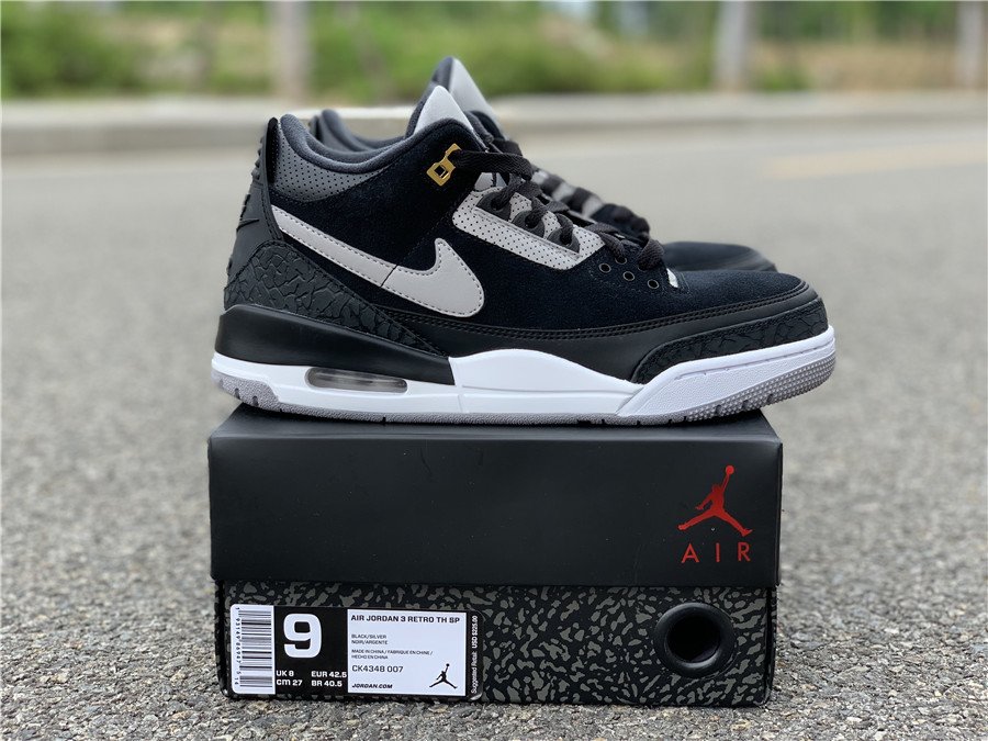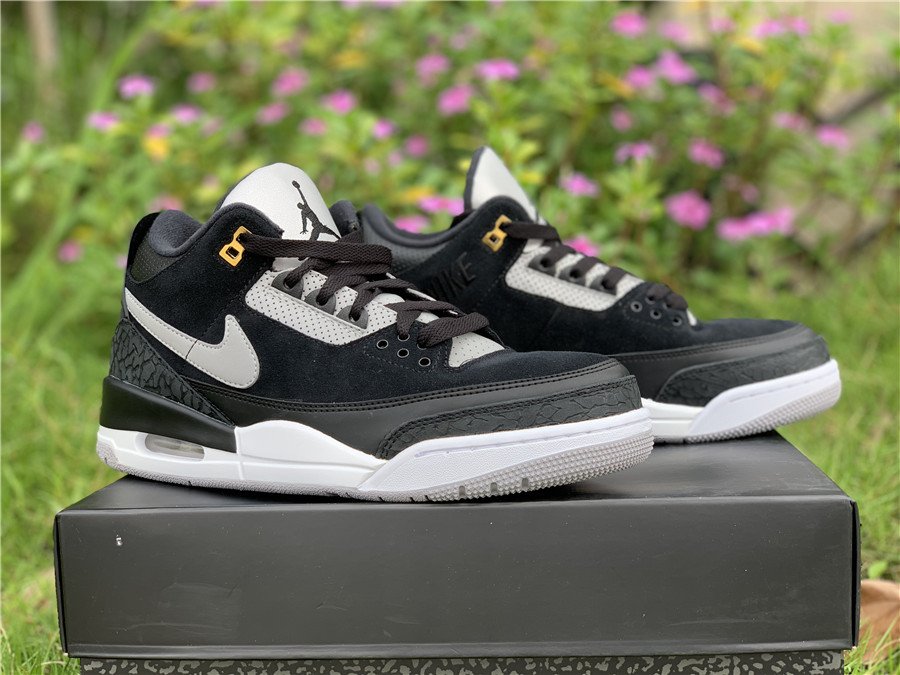 Looking closer this Air Jordan 3 Tinker features Black suede and leather across the upper while Black also fills in the elephant print on the overlays. Following is the use of Cement Grey on the tongues, Swoosh and tonal Black ‘Nike Air’ branding on the heel. Other highlights includes Metallic Gold on the tope two eyelets, White midsole, Grey rubber outsole and 3M Reflective detailing across the Swoosh and eyelets.