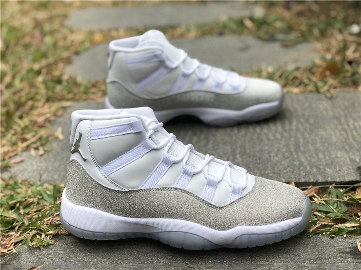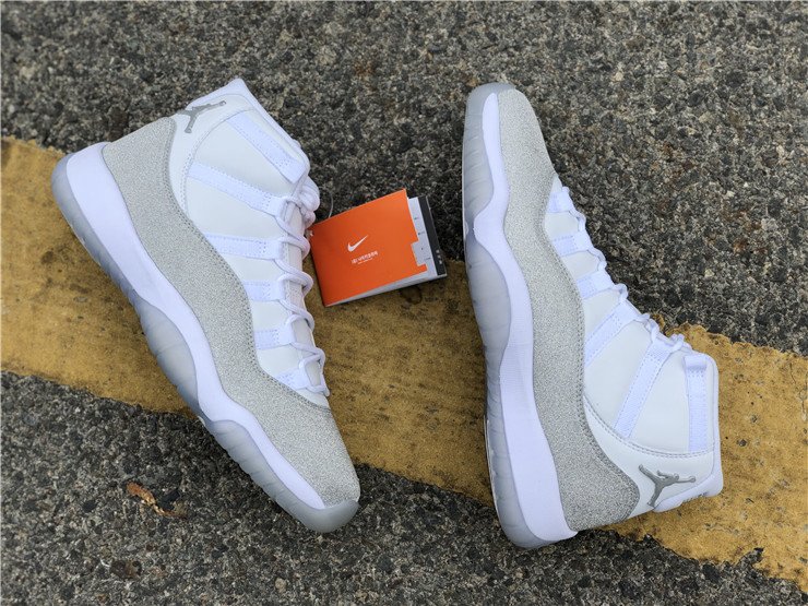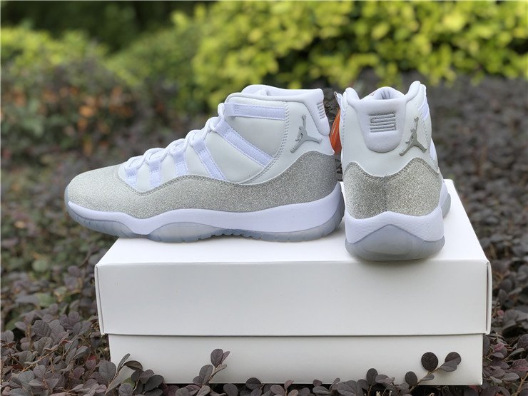 This women’s-exclusive variation of the Air Jordan 11 is covered in an official theme of White, Metallic Silver and Vast Grey. This elevated rendition of the sneaker dons a white leather upper while the traditional patent mudguard is upgraded with a shiny, glittered silver finish instead for a luxe lifestyle theme. Finally, a white midsole and lightly tinted translucent outsole tops off the design.