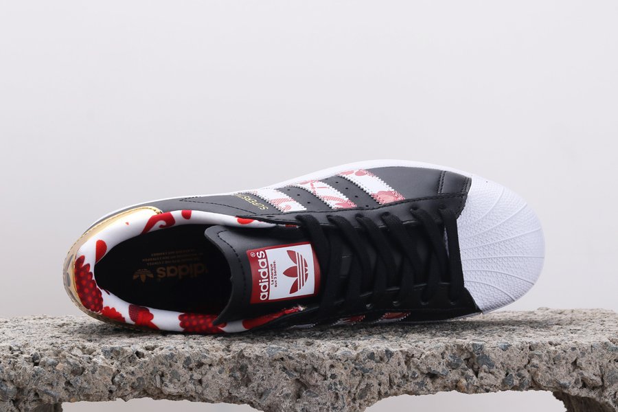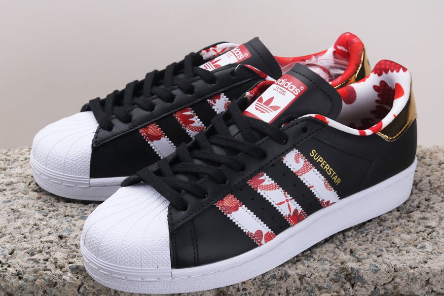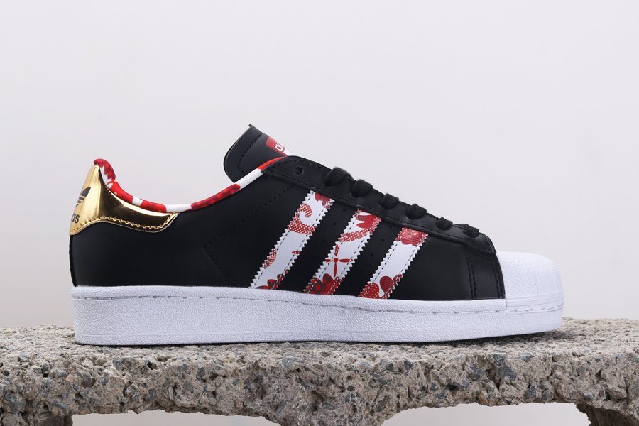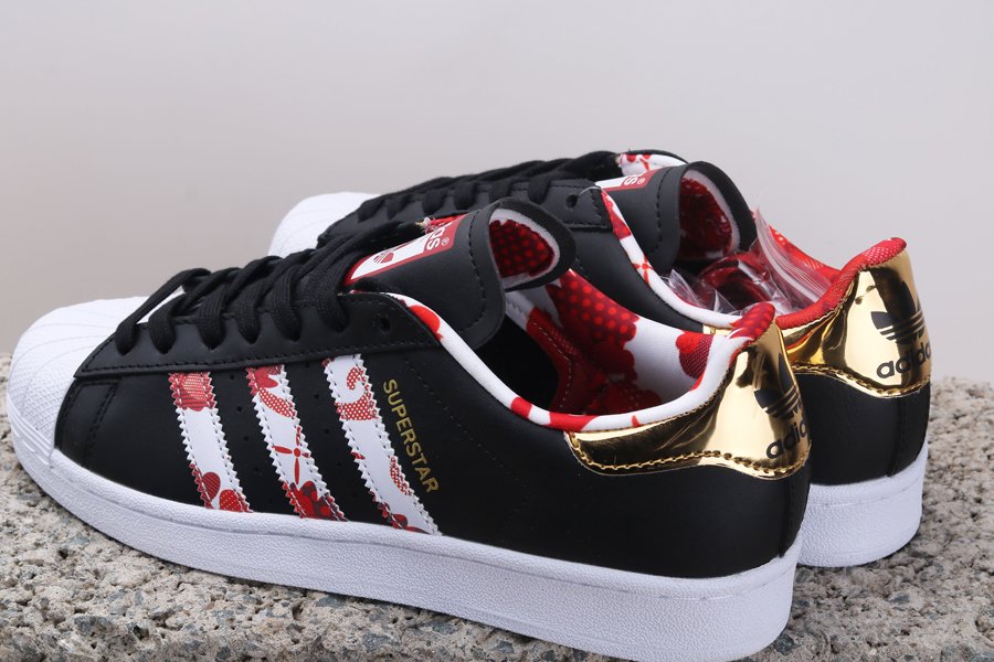 This adidas Superstar comes with a Black upper offset by the Metallic Gold detailing and the Asian-inspired illustration graphics noted on the lining and Three Stripes branding. Black laces, Red Trefoil branding on the tongue, a White midsole and White shell toe round out the main features of the shoe.