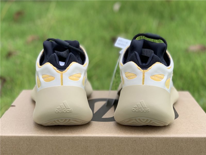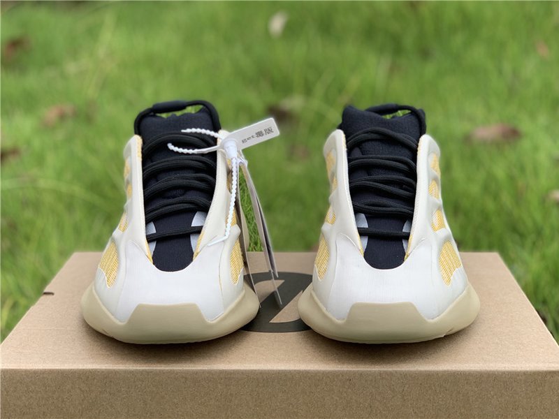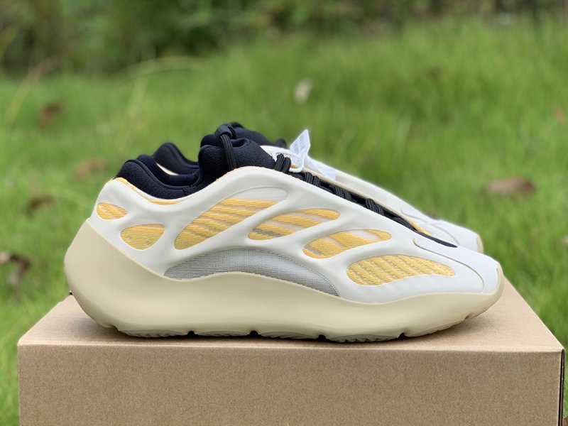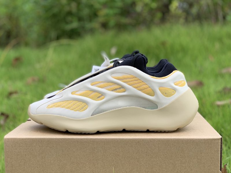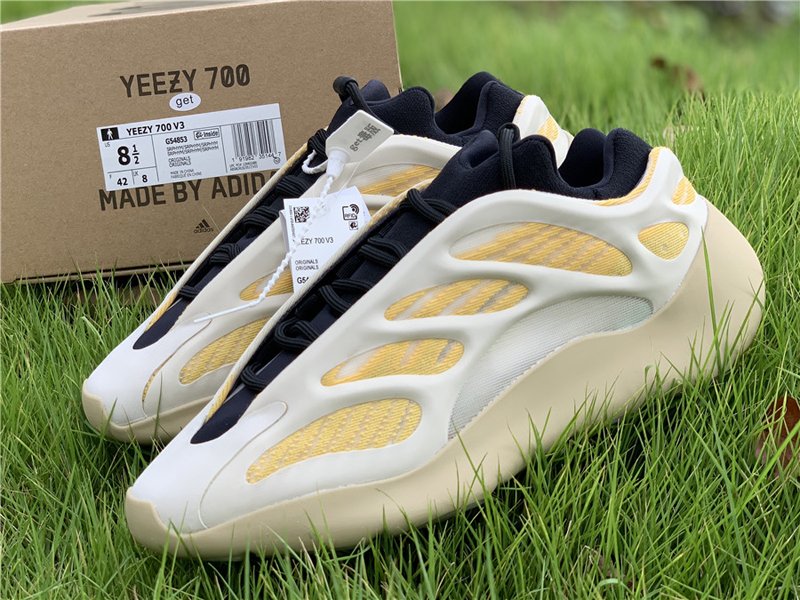 Featuring vibrant Yellow Primeknit uppers paired with a semi-translucent reinforcing cage overlay, the model is contrasted with black for the lining, laces and tongues. Additionally, the model flaunts a white rubber toe. Unlike the original and V2 version of the 700, the Yeezy 700 V3 does not incorporate a Boost midsole, but instead, boasts an EVA foam cushioning to top it all off.