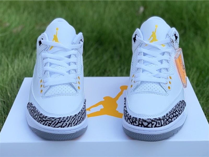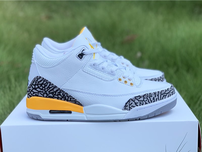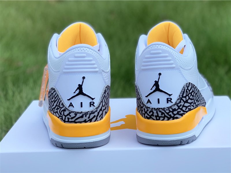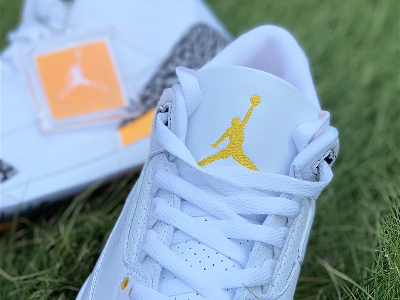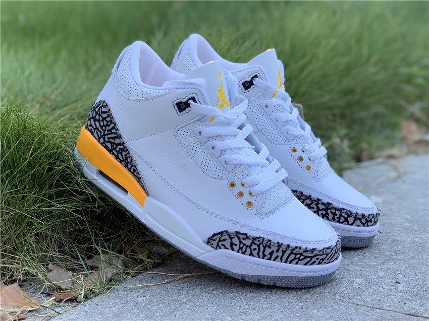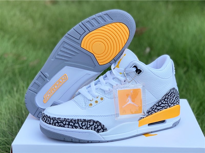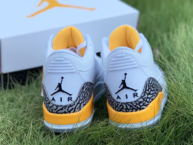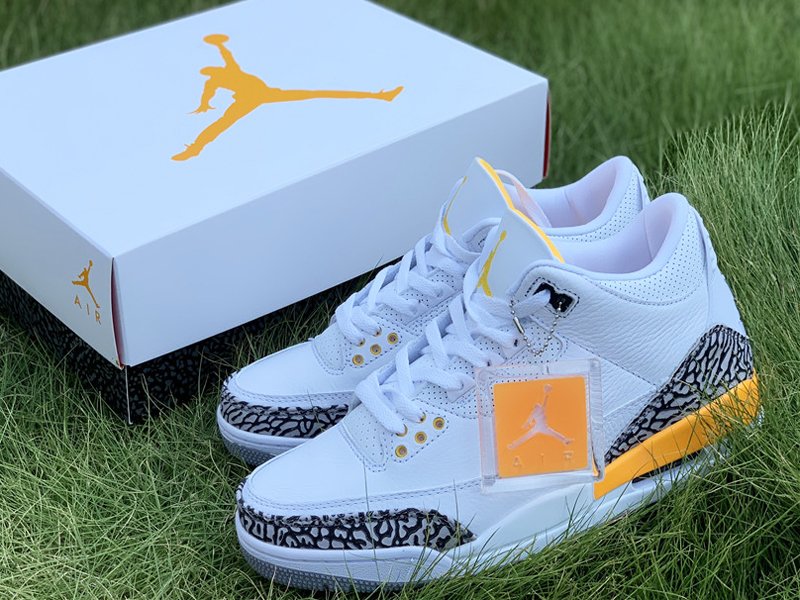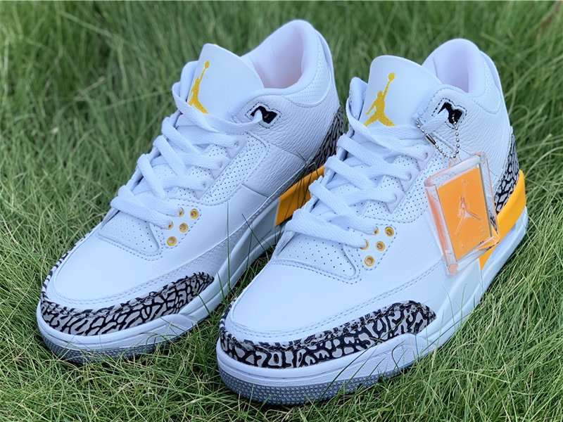 Crafted from tumbled leather, the “Laser Orange” boasts a predominantly white upper with vibrant orange accents making their way to the tongue and eyelets. The AJ3’s signature hangtag features, encasing a Jumpman silhouette within it.