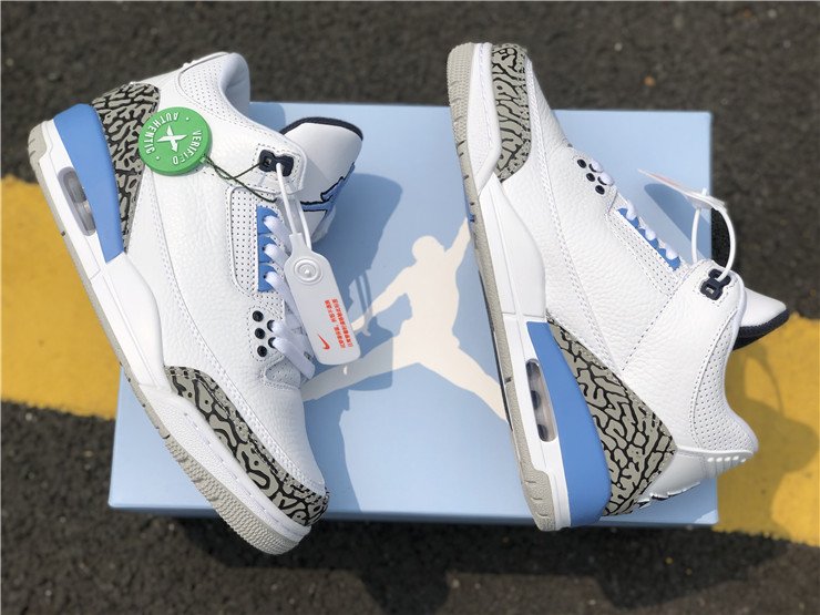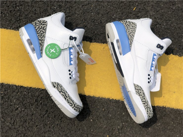 Done in a White/Valor Blue-Tech Grey color scheme, this iteration of the Air Jordan 3 comes dressed in a White leather upper two shades of Blue noted on the branding, eyelets and part of the midsole. The iconic Elephant print is spotted on the toe and heel overlays. As mentioned above, this pair comes with Jumpman branding on the tongue instead of the UNC logo. The images above also show that the Air Jordan 3 UNC could also be coming with a new Jordan box that matches the colors of the shoe.