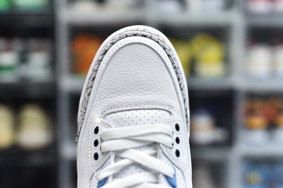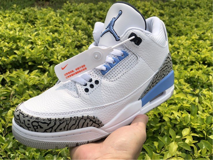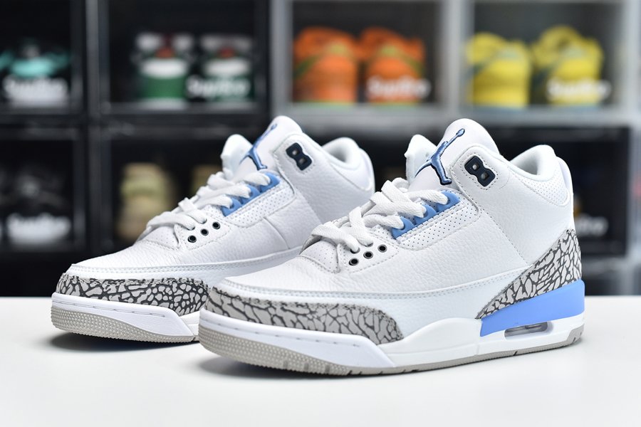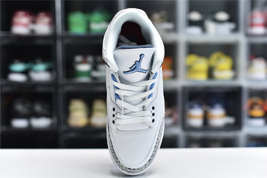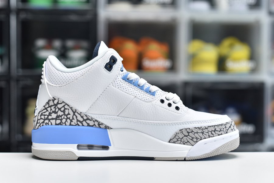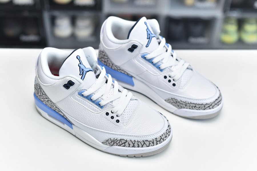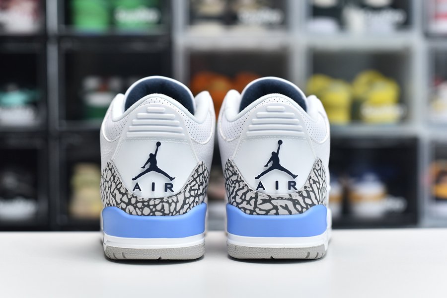Done in a White/Valor Blue-Tech Grey color scheme, this iteration of the Air Jordan 3 comes dressed in a White leather upper two shades of Blue noted on the branding, eyelets and part of the midsole. The iconic Elephant print is spotted on the toe and heel overlays. As mentioned above, this pair comes with Jumpman branding on the tongue instead of the UNC logo. The images above also show that the Air Jordan 3 UNC could also be coming with a new Jordan box that matches the colors of the shoe.