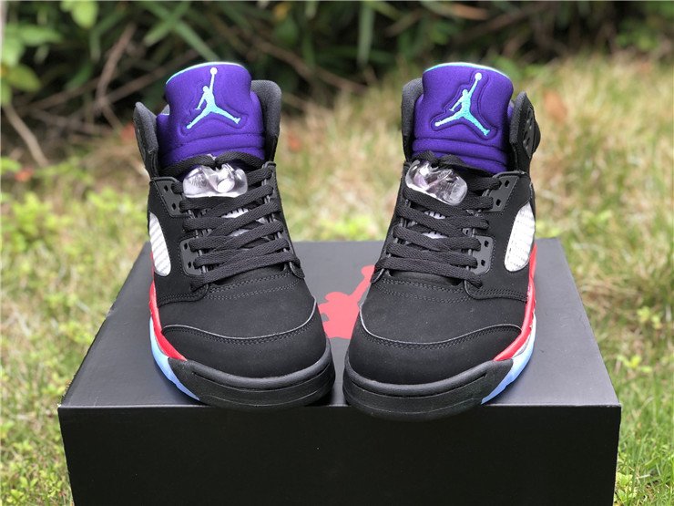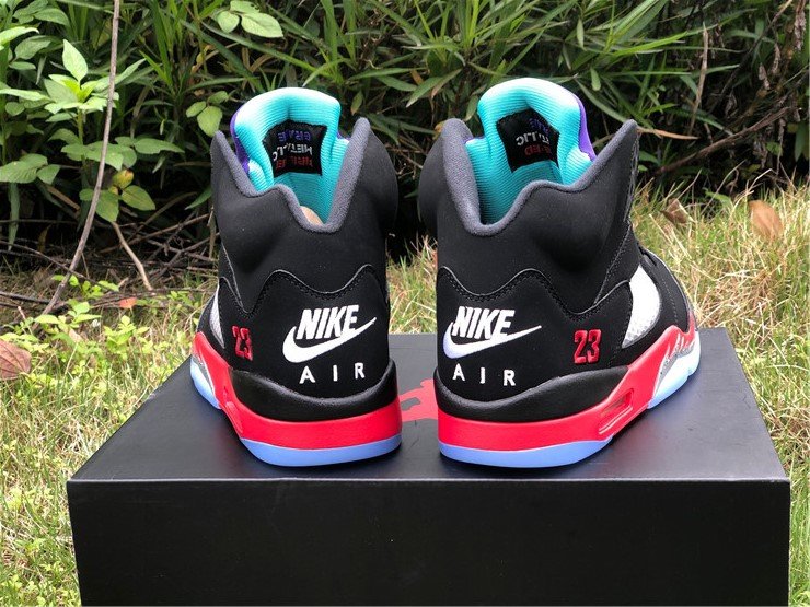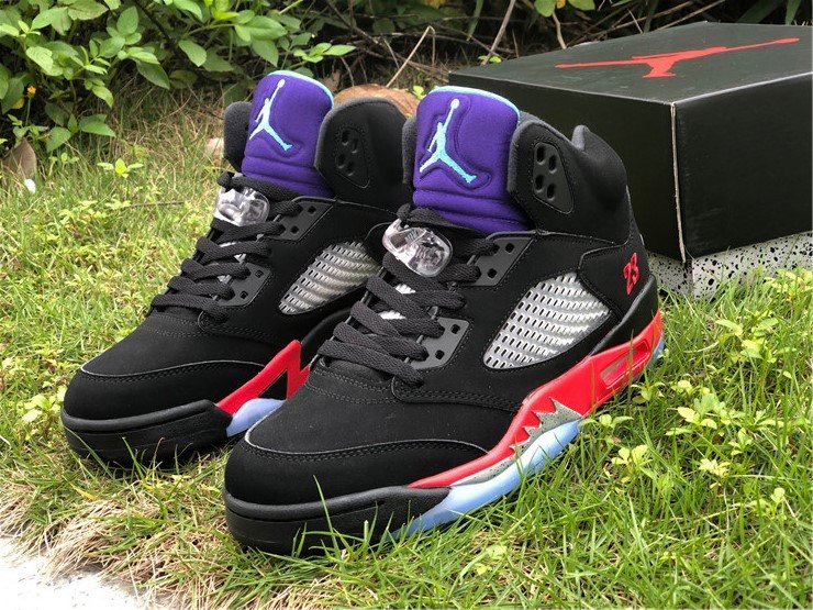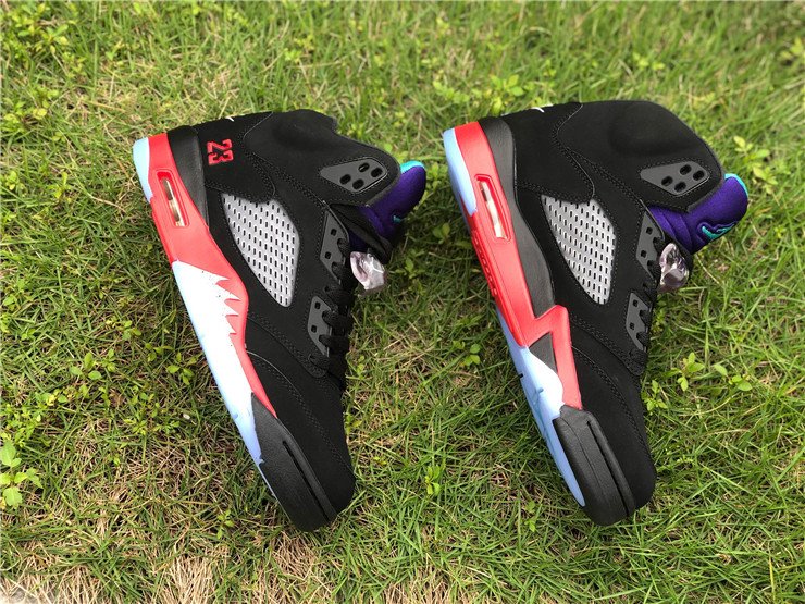 This Air Jordan 5 “Top 3” combines classic Air Jordan 5 colorways such as the “Black Metallic”, “Fire Red”, and “Grape” releases all in one shoe. Done in a Black/Fire Red-Grape Ice-New Emerald color scheme, the shoe shows a black upper while its contrasting accents can be found on areas such as the midsole, branding and tongue lining. Finally, the model bears “Nike Air” branding on its heels to top it off.