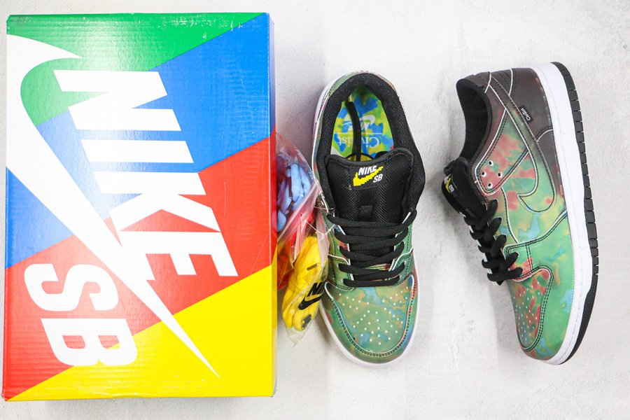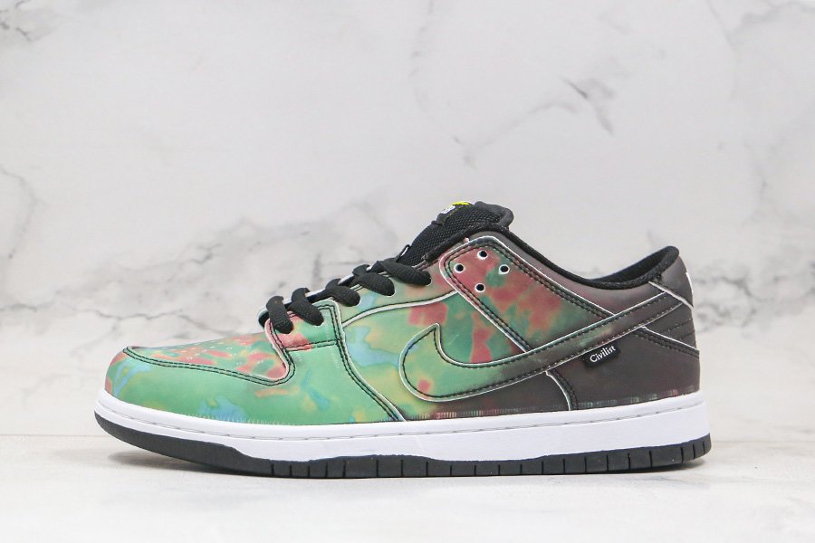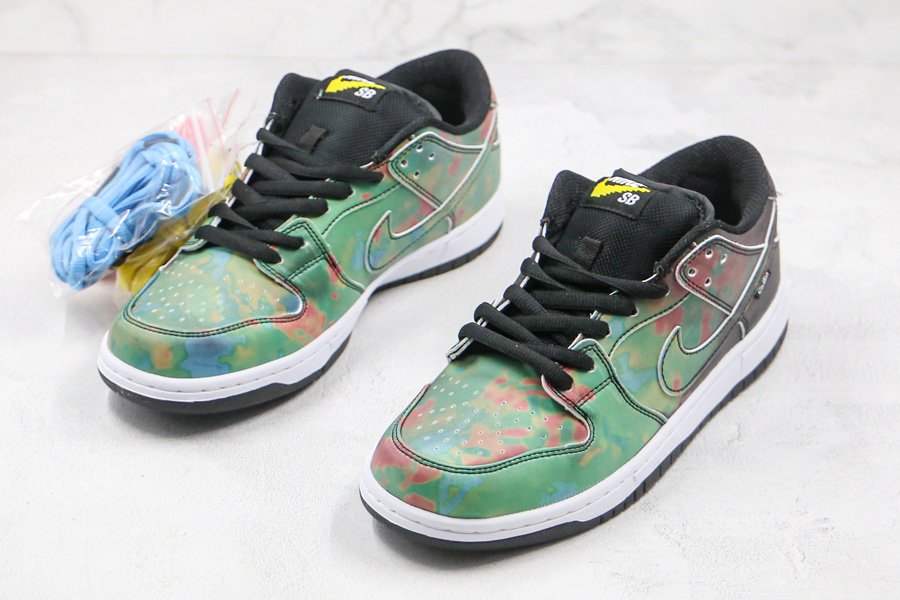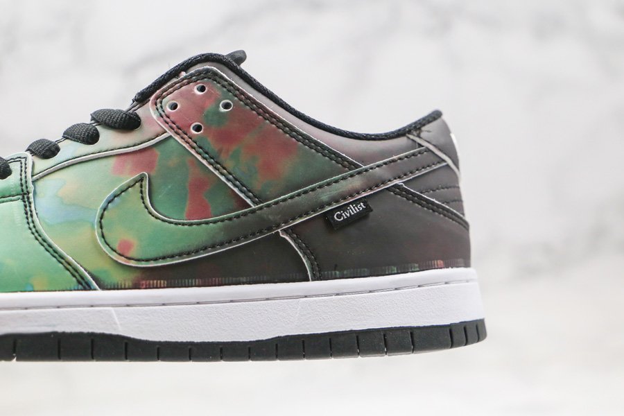 The Civilist x Nike SB Dunk Low initially appeared in its activated form; the upper is heat-activated. Presumed to be a relatively understated collaboration initially, the pair quickly subverted assumption with an all-over thermochromic finish. Fresh out of the box, the pair seems quite neutral with a full black upper and matching accents, but once exposed to heat, a vibrant heat map reminiscent pattern begins to appear. Dark reds, lighter greens, and blues display the entire temperature spectrum, each placed as if gradating from the heel to the toe box. Neutral-toned toolings, linings, and tongues arrive bereft of the focal treatment, though the latter does deliver color by way of a variety of laces as well as yellow-checked tongue patch.