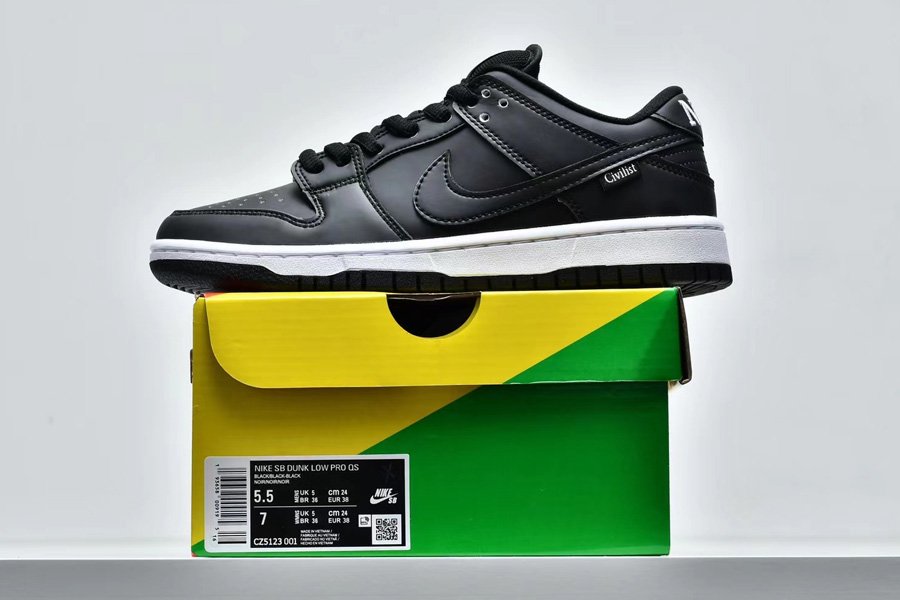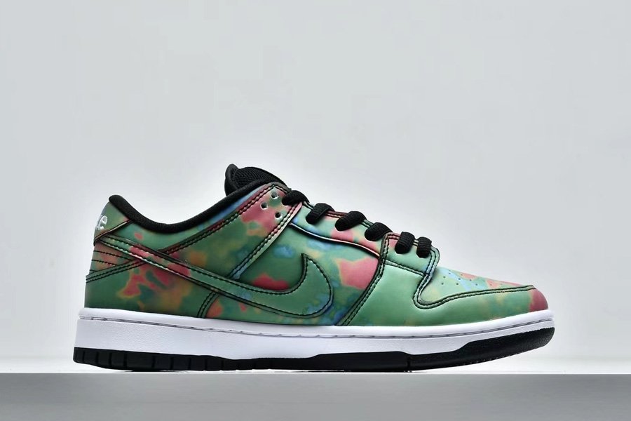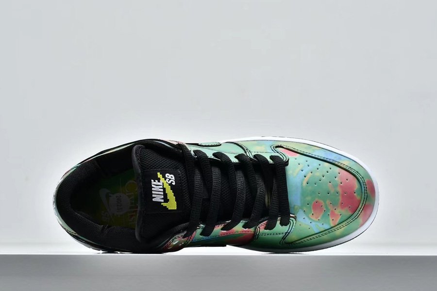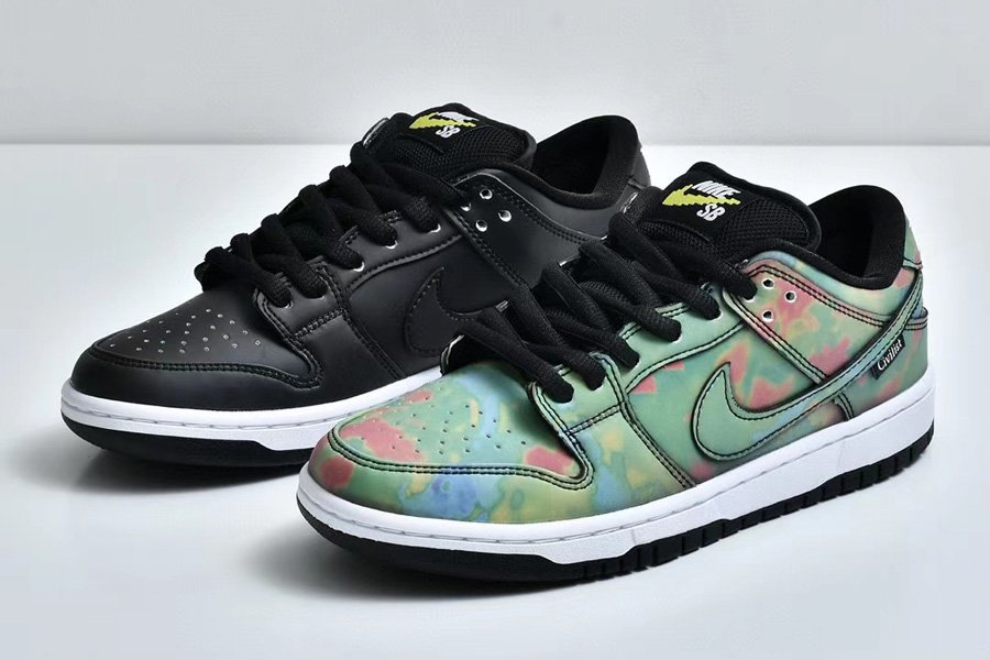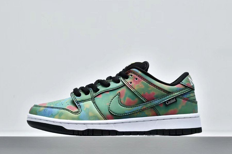 The Civilist x Nike SB Dunk Low initially appeared in its activated form; the upper is heat-activated. Presumed to be a relatively understated collaboration initially, the pair quickly subverted assumption with an all-over thermochromic finish. Fresh out of the box, the pair seems quite neutral with a full black upper and matching accents, but once exposed to heat, a vibrant heat map reminiscent pattern begins to appear. Dark reds, lighter greens, and blues display the entire temperature spectrum, each placed as if gradating from the heel to the toe box. Neutral-toned toolings, linings, and tongues arrive bereft of the focal treatment, though the latter does deliver color by way of a variety of laces as well as yellow-checked tongue patch.