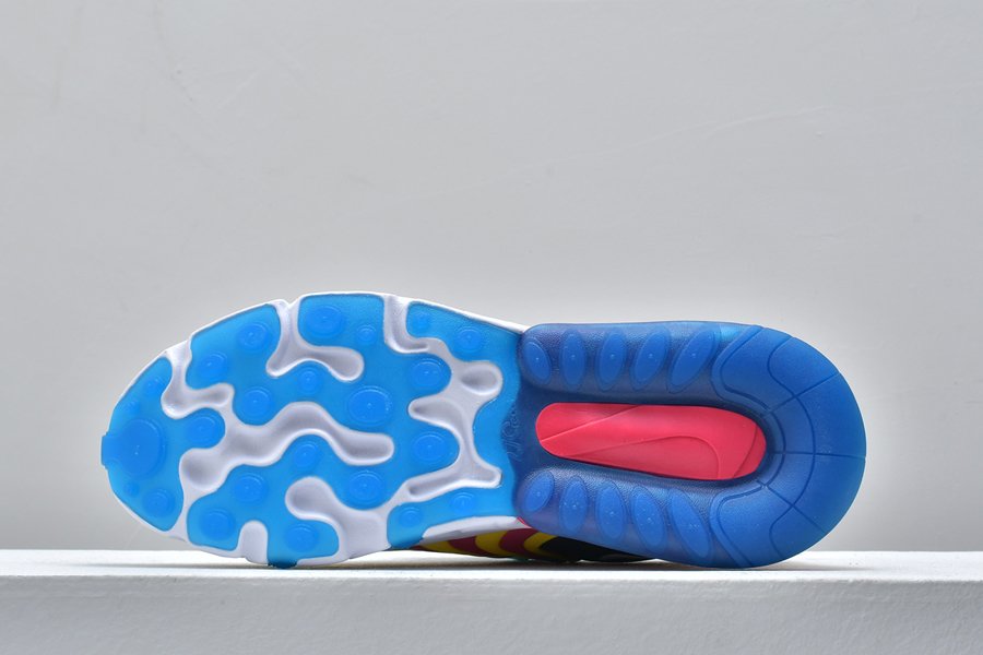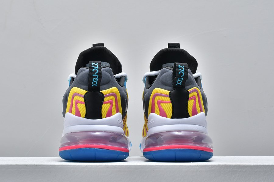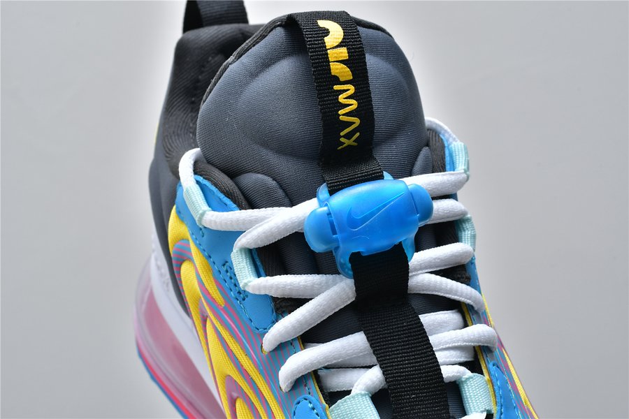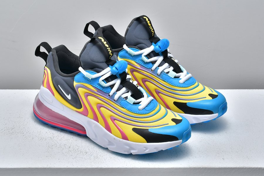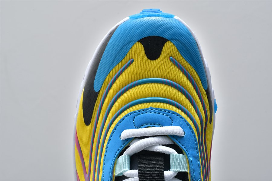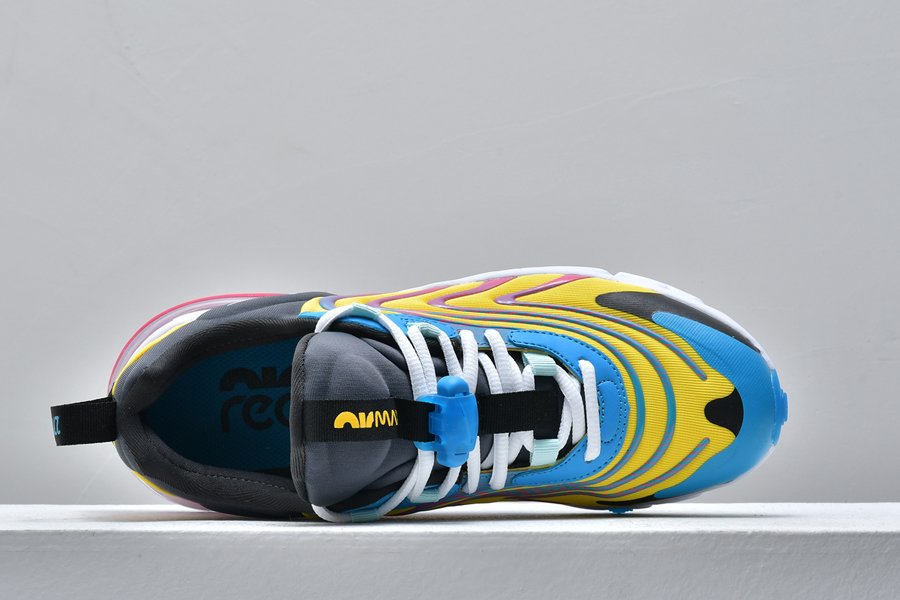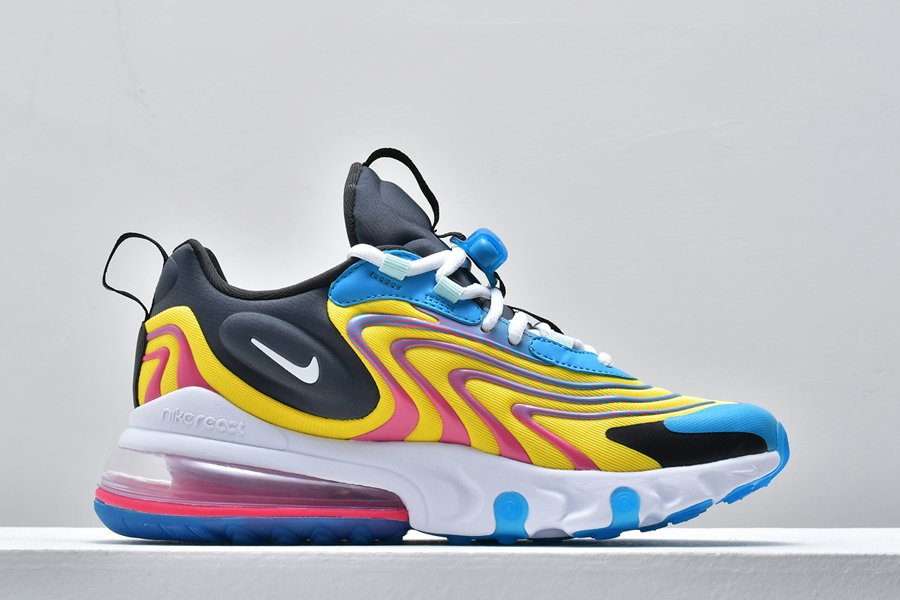 The Nike Air Max 270 React ENG boasts a yellow mesh construction on a large portion of the upper which is then offset by wavy curved plastic lines on the toe, side panels, and heel in a pink/blue gradient. Bright blue is then placed on the leather eyelets and toe cap overlays, while black is applied on the molded neoprene on the tongue and ankle. Finishing details include a new lace lock, a white React midsole with a translucent Air Max 270 heel unit, and a bright blue and pink rubber outsole.