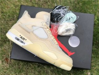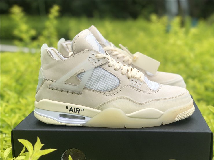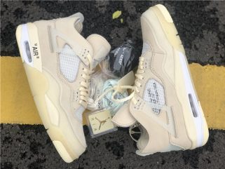 The Air Jordan 4 “Sail” comes with Off-White’s signature deconstructed motif and includes familiar details such as the “AIR” branding printed on the midsole, a Cream zip-tie and hangtag. The images also show that the shoe is equipped with a translucent heel tab, raw edges, a see-through layer placed about the tongue branding and semi-translucent honey comb eyelets.