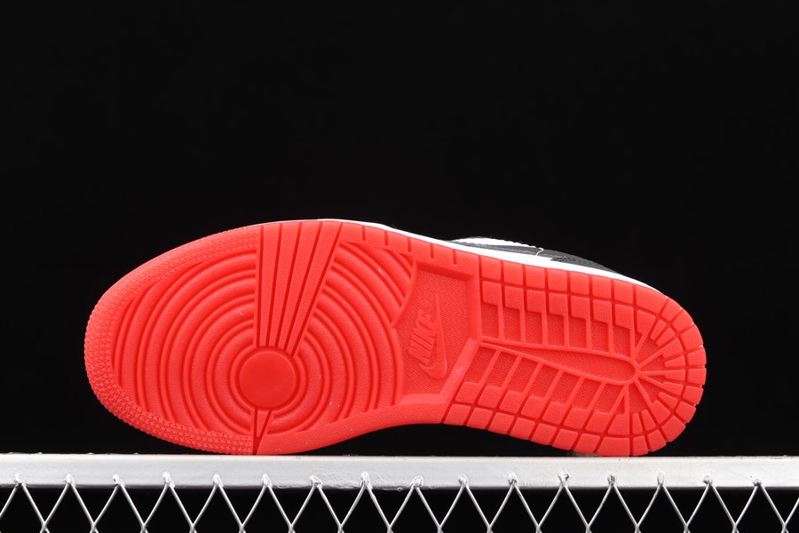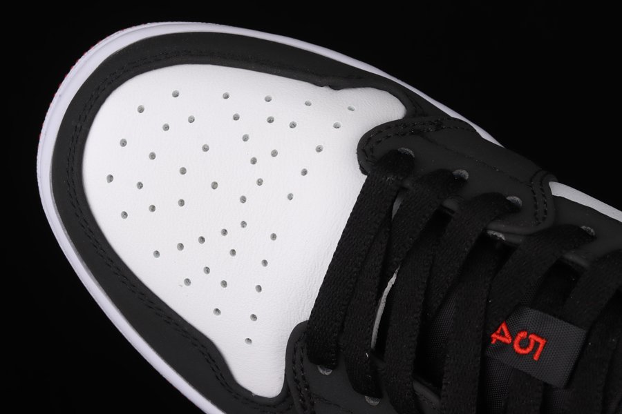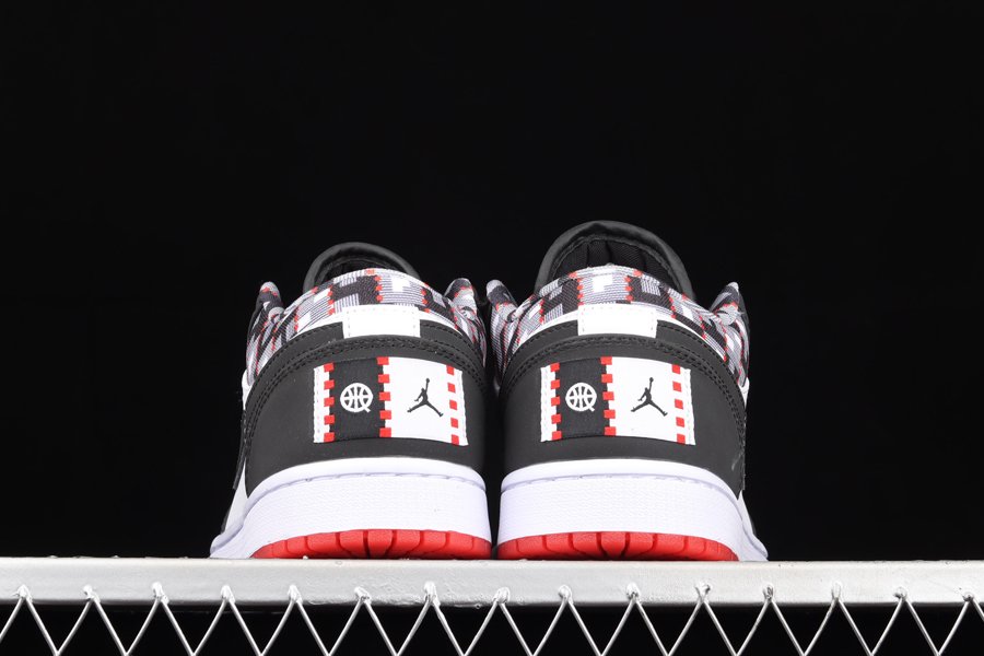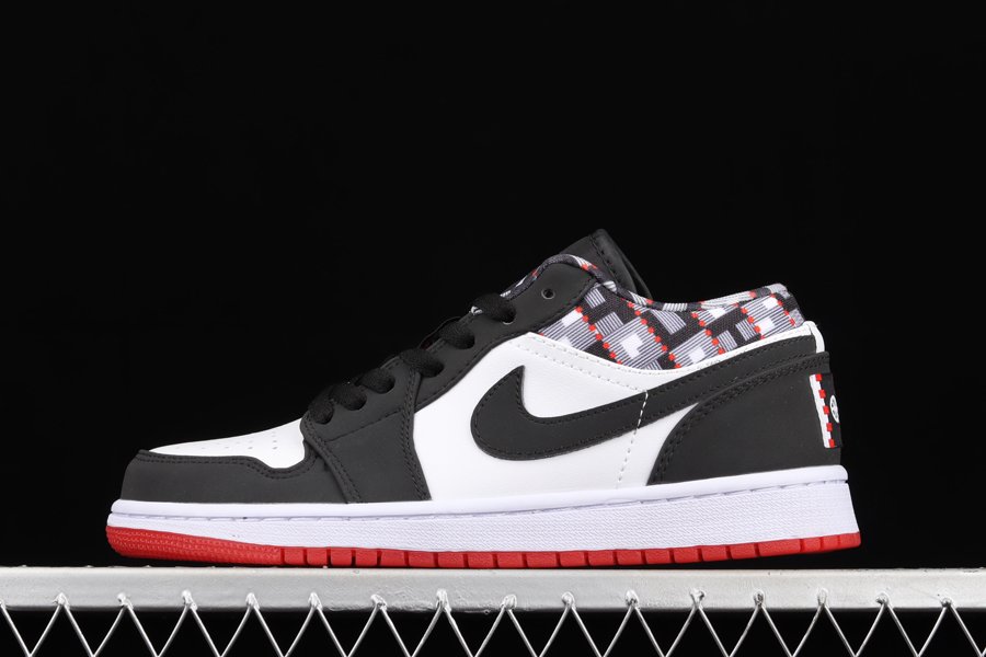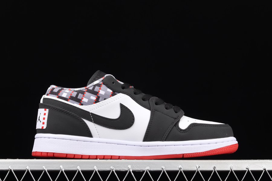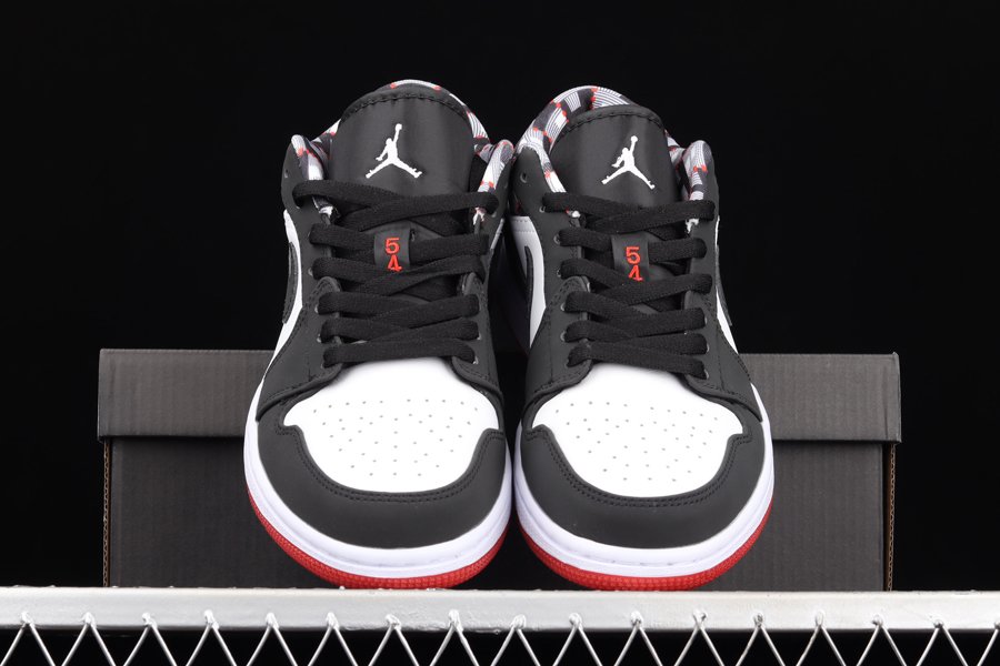 Utilizing a white leather base with black overlays, accenting can be seen in the liner with a Kente cloth-inspired print which draws inspiration from the African and Parisian heritage. “54” is seen on the lace loop on the tongue in red with the Jumpman logo seen in white. A co-branded jock tag is stitched on the heel with a white midsole and transparent red outsole finishing off the sneaker.