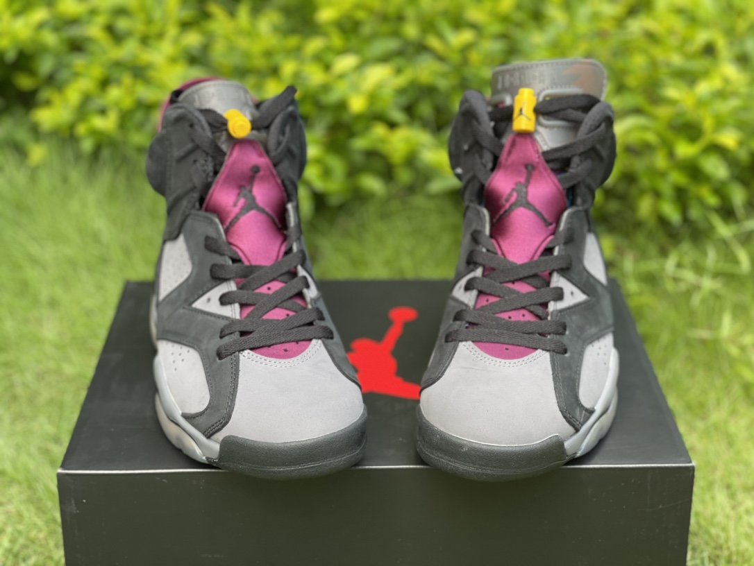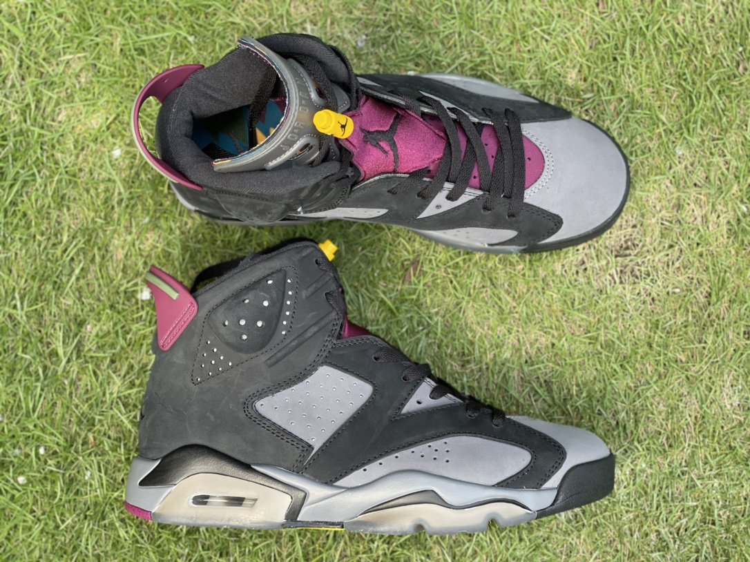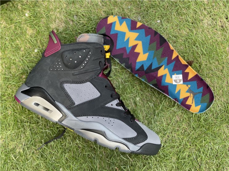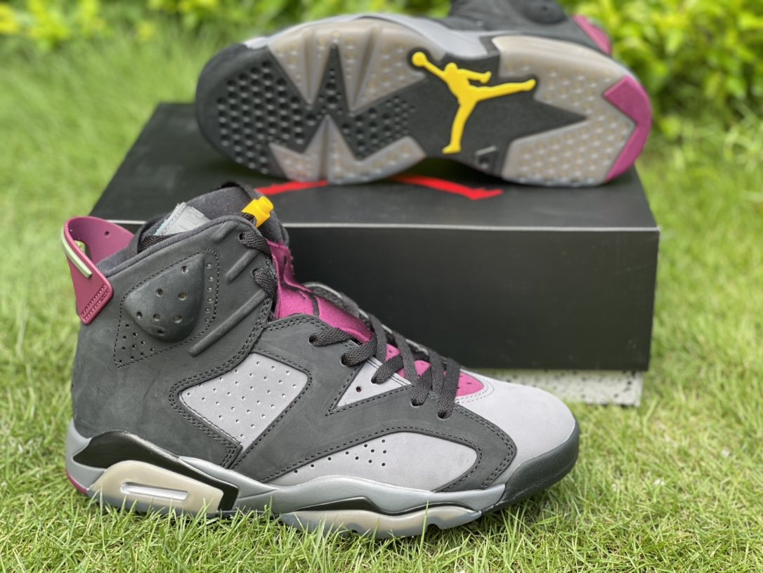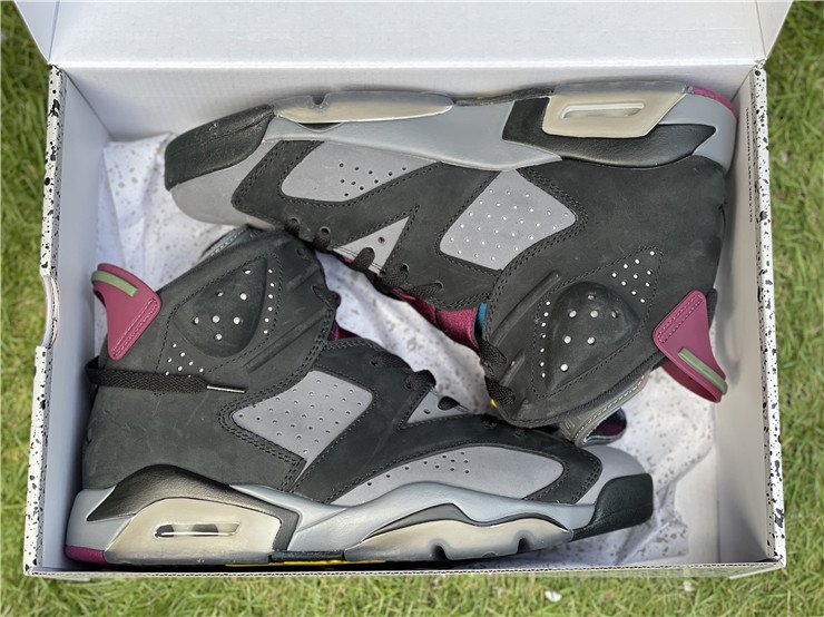 The Air Jordan 6 Retro ‘Bordeaux’ takes on a familiar color scheme tied to the shoe’s successor, the Air Jordan 7. Soft nubuck construction is utilized on the upper, featuring a neutral grey base with contrasting black overlays. The translucent tongue features a multicolor print that replicates the look of the AJ7’s neoprene tongue, while Bordeaux accents land on the throat and molded heel tab. Lightweight cushioning arrives via the visible Air-sole unit nestled in the heel of a grey and black polyurethane midsole.