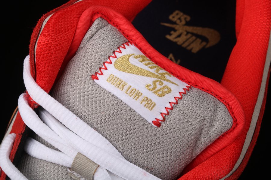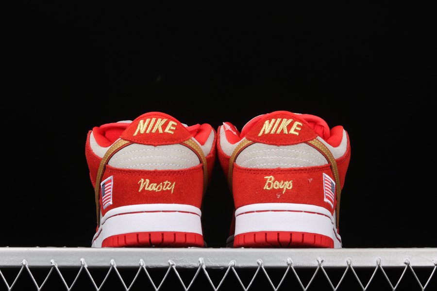 The red/gray base and American flag heel patch are both left intact, but the gold Swoosh is replaced by SBTG’s signature camouflage print for an artisanal tweak. Both the tongue tag and lace deubre have been swapped out for signature SBTG embellishments as well. A special custom tag completes the stylings.