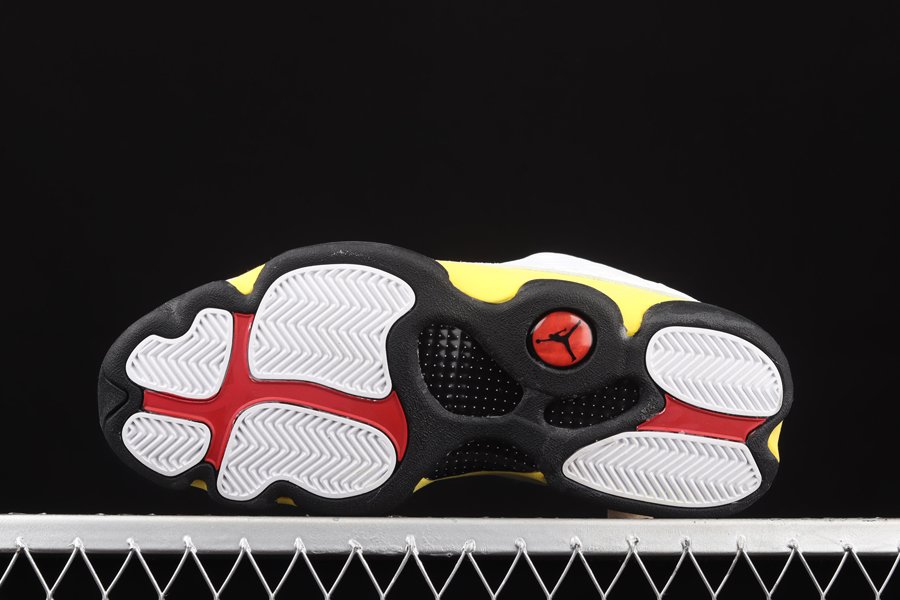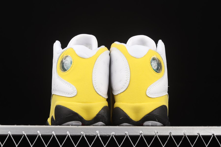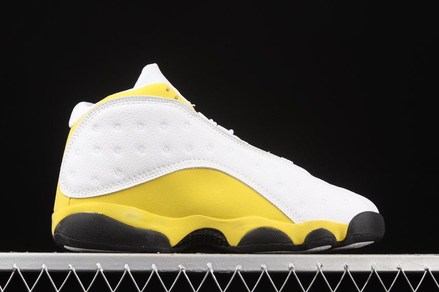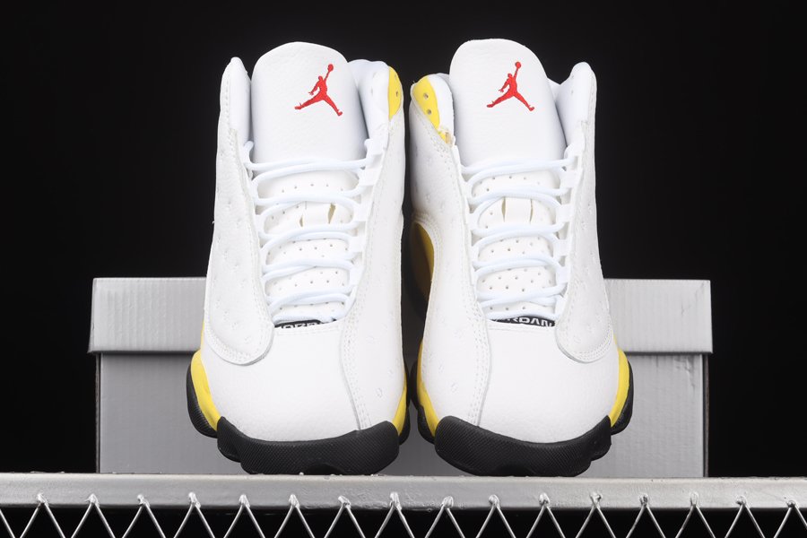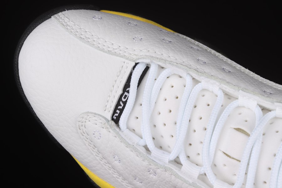 The Air Jordan 13 “Del Sol” sports an official color scheme of “White/University Red-Del Sol-Black,” the mockup rendering provided suggests quilted white leather on the upper panels while the highlight Yellow (Del Sol) tone is prominent on the suede overlays and heel area. Finally, red appearing on the Jumpman-branded tongue, signature holographic eye on the heel, and a black rubber sole tops it off.