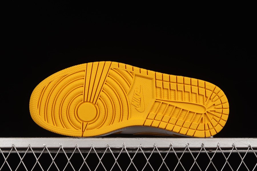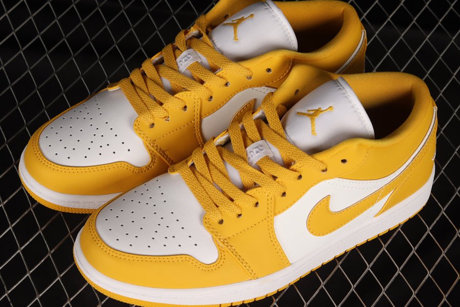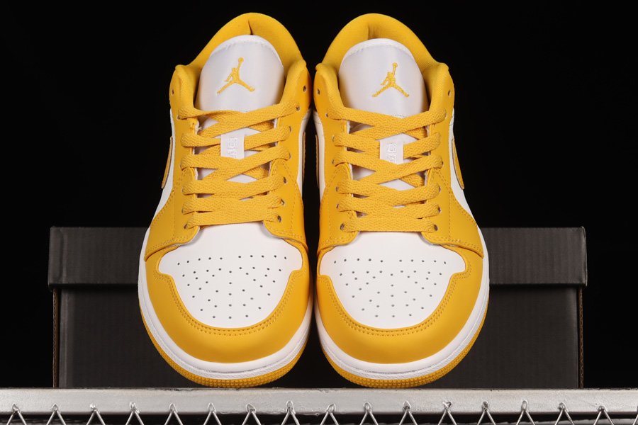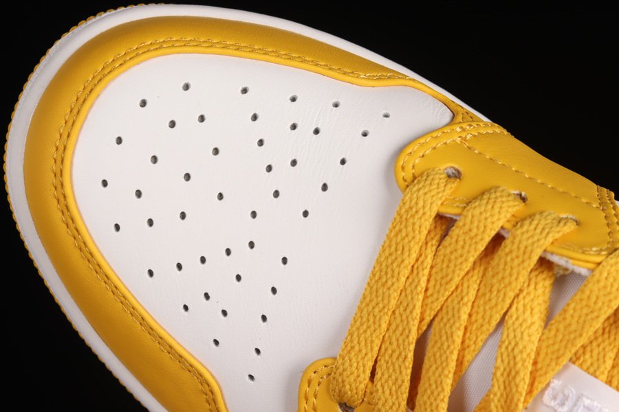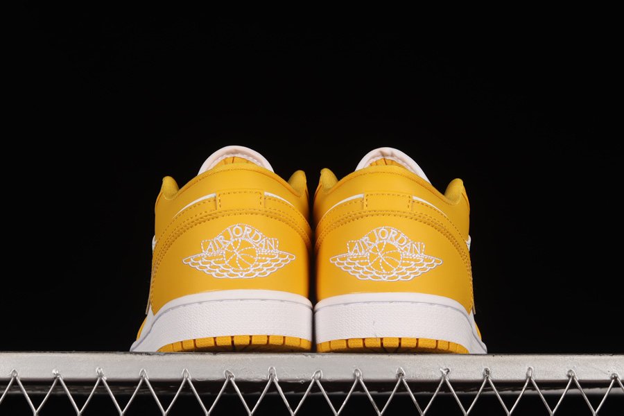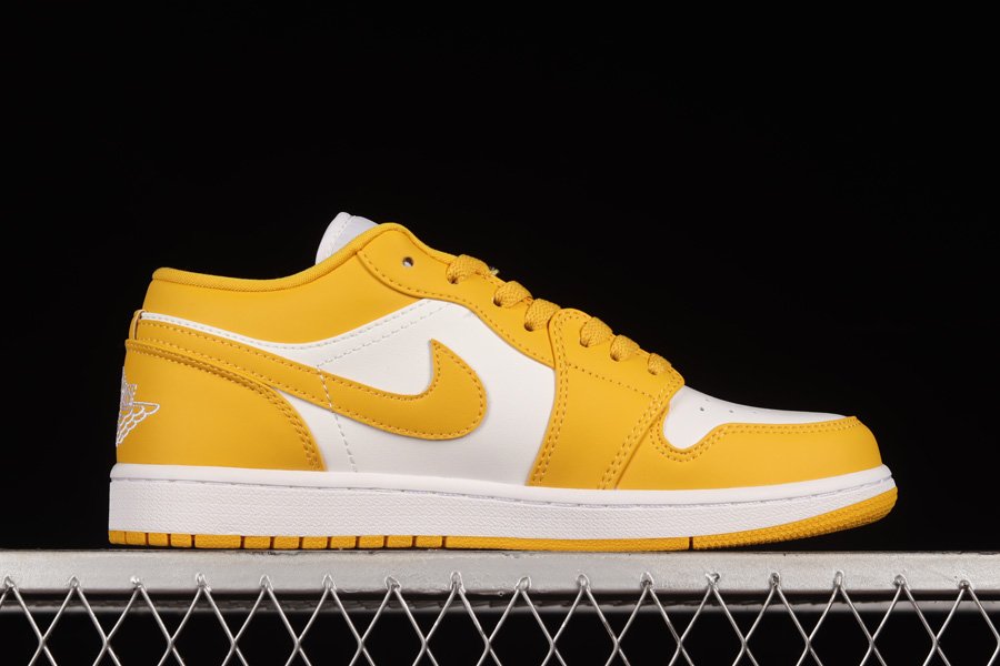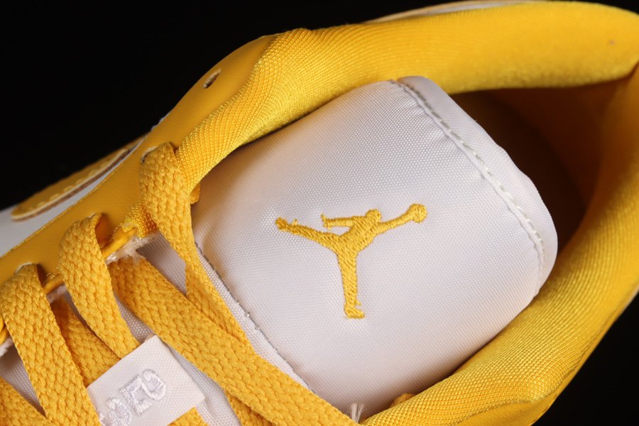The low-top Air Jordan 1 features a White leather base paired with Pollen Yellow on the overlays, Swooshes, laces, tongue branding, insoles, and rubber outsole. White Wings logo in the rear atop a matching midsole completes the design.