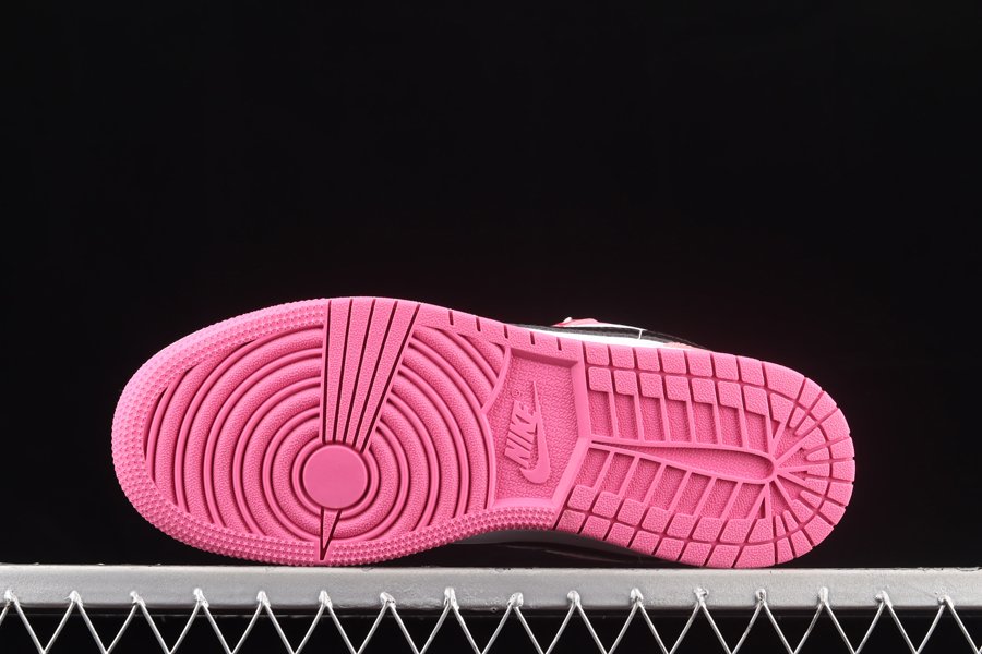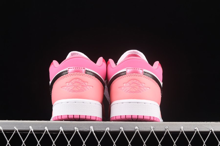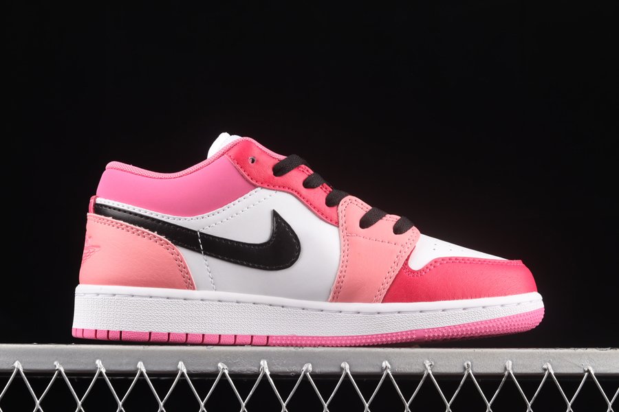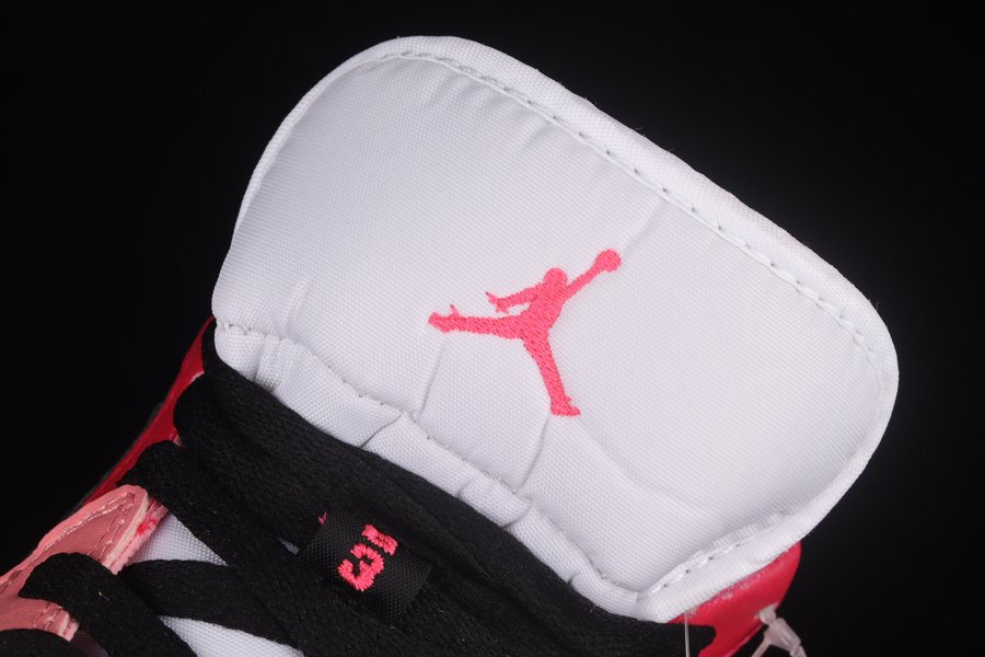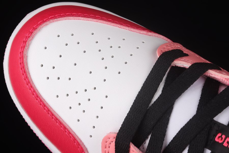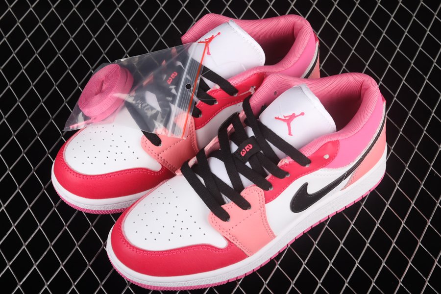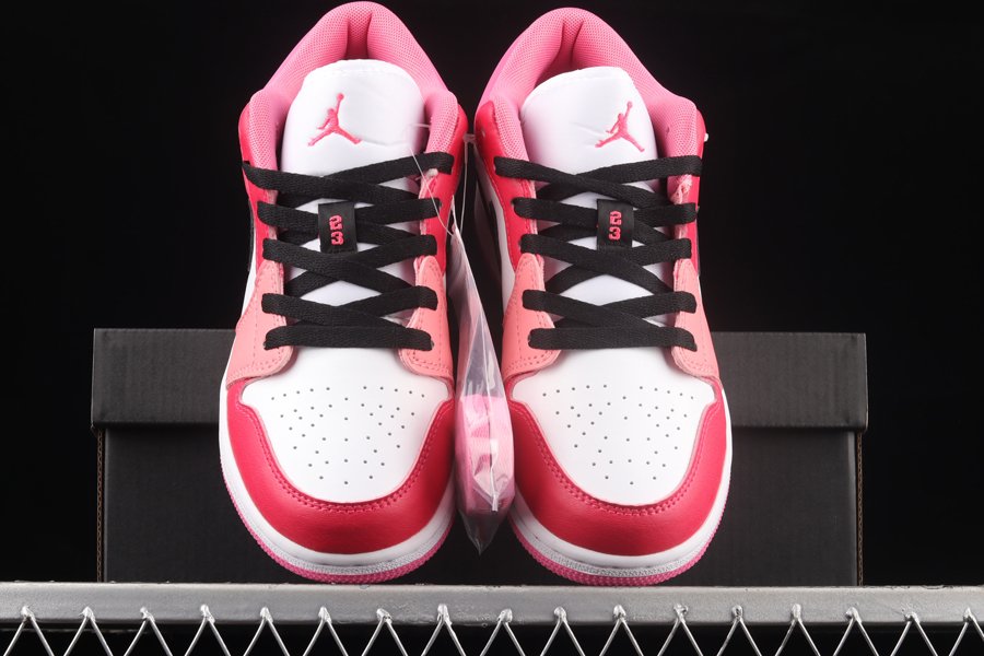 The Air Jordan 1 Low Pink has an all-leather upper. A white base is accented with red and pink overlapping accents. Additional details include the iconic winged logo stamped on the heel of the pair, and the number 23 embroidered on the tongue loop.