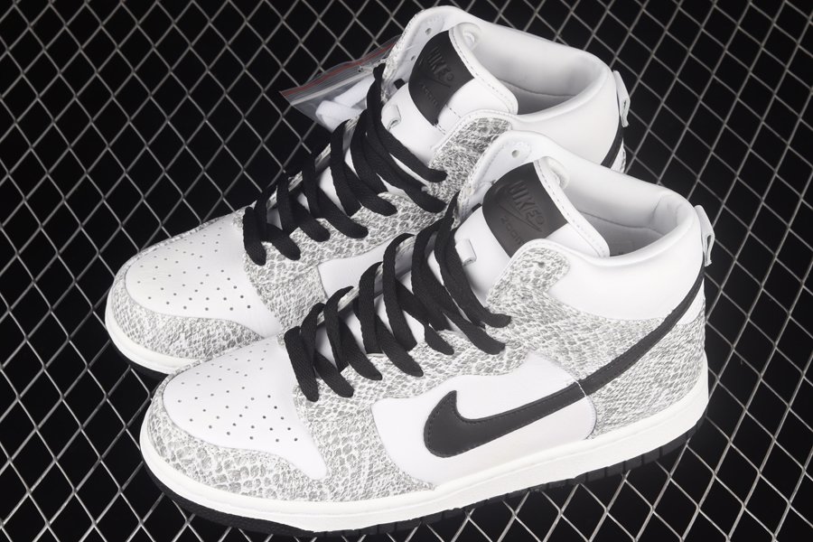 Utilising the classic silhouette of the iconic Nike Dunk High, this reworking features strong snake skin overlays with a solid black swoosh and lace unit. Bringing back a colourway first seen in Air Force 1 Lows over a decade ago, the skate-shoe inspired SP is finished with distinctive white grain leather underlays and heel tab.