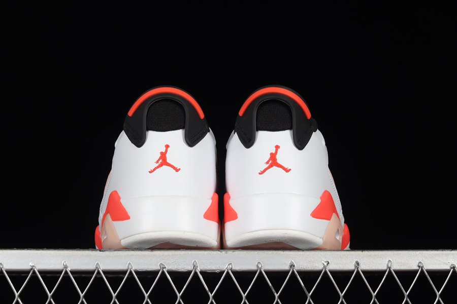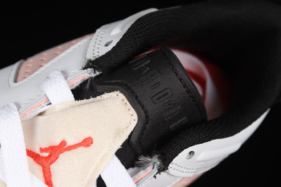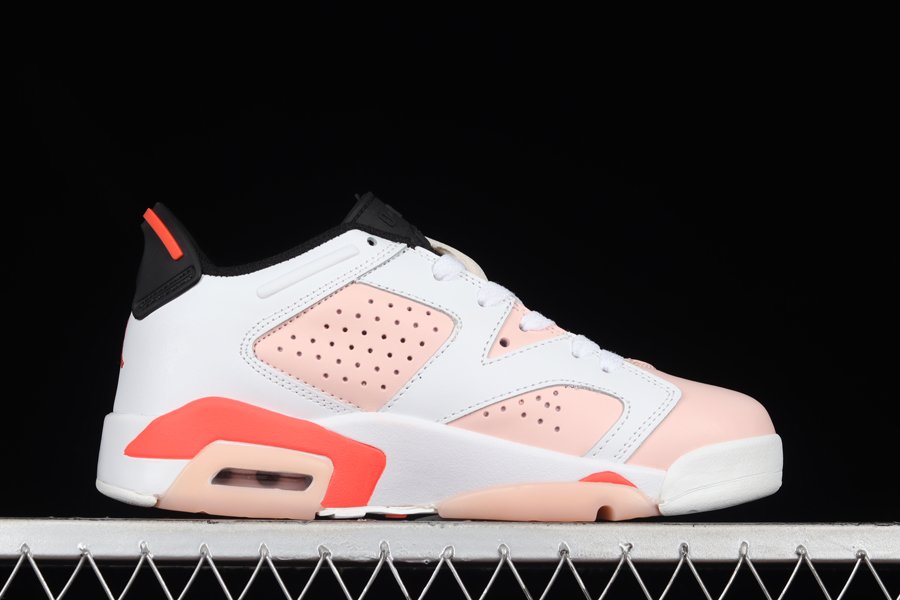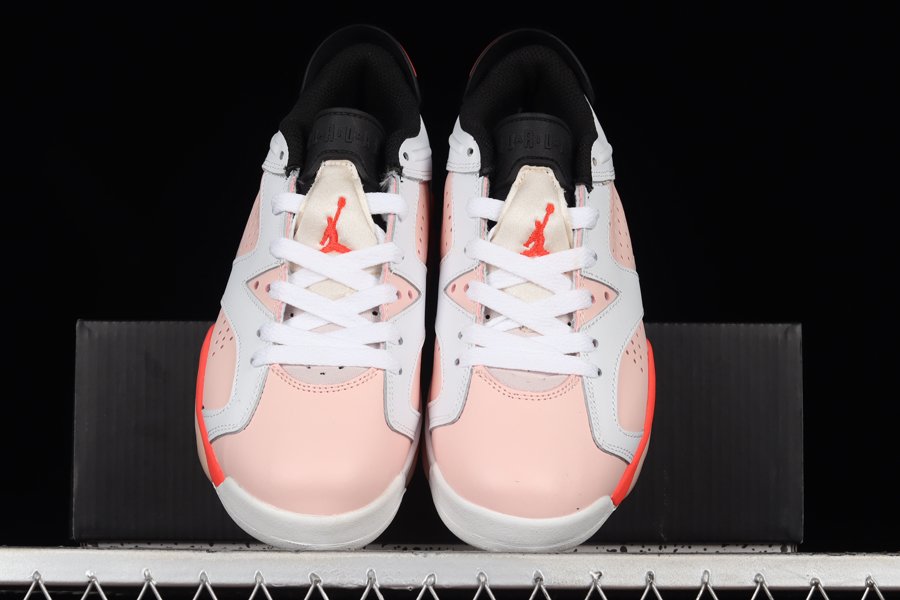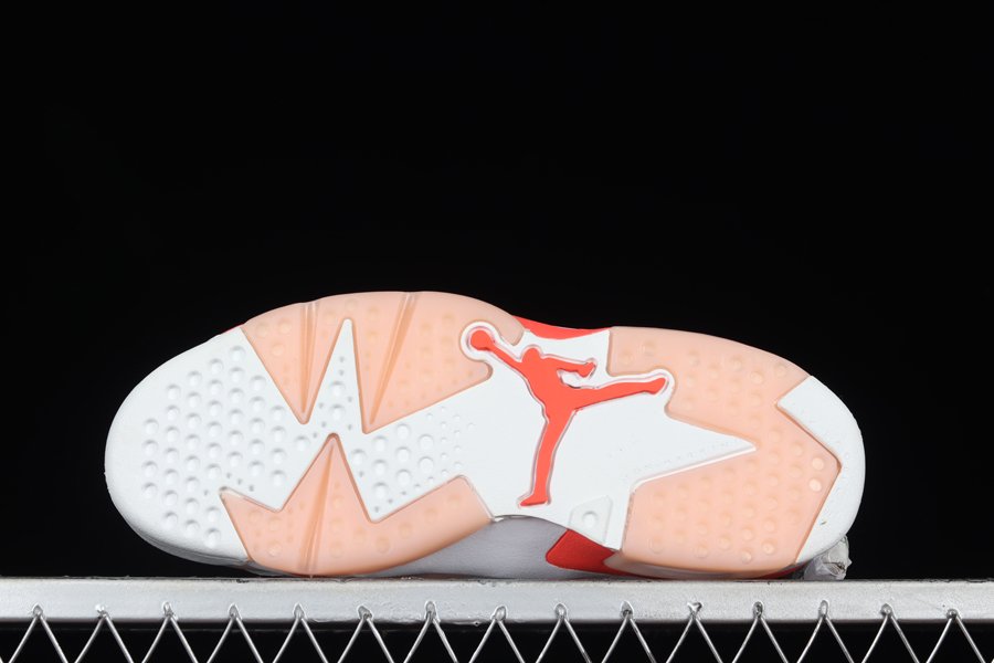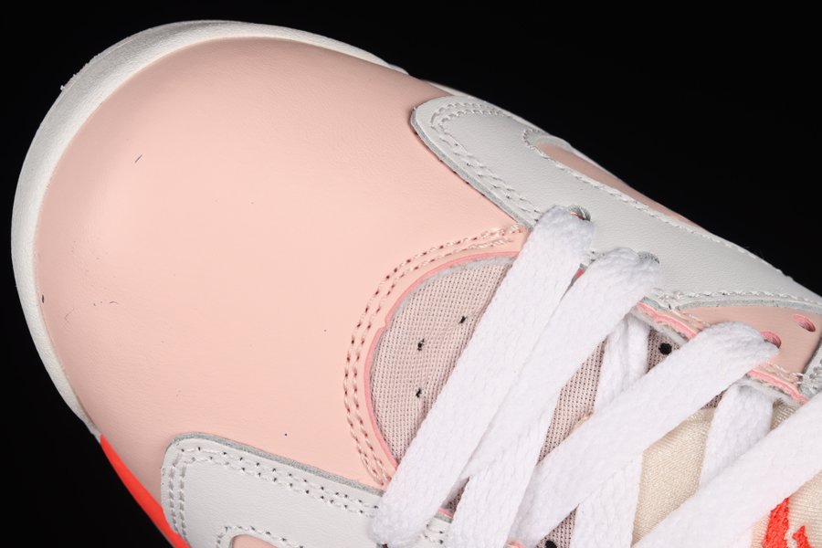 The Air Jordan 6 uses a blush pink nubuck base on the upper with white leather overlays. The tongue, liner, and pulltab are seen in black with Infrared accenting seen on the lace pouch Jumpman, toggle, Jumpman on the heel and pulltab. The midsole features white and Infrared with the outsole seen in translucent blush pink and white.