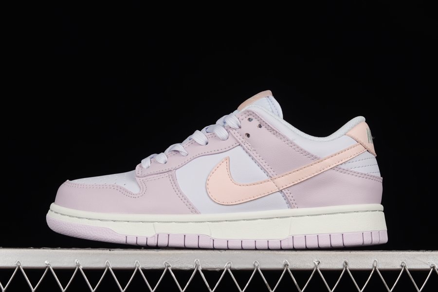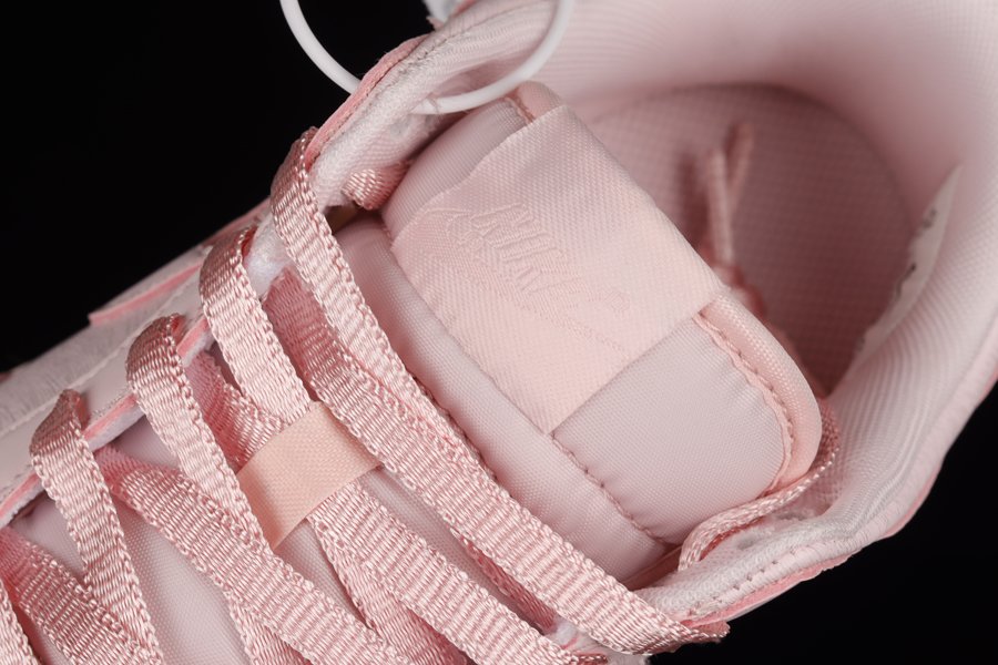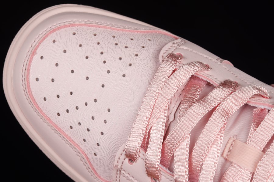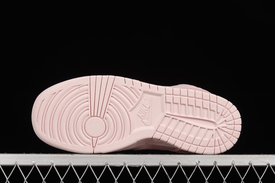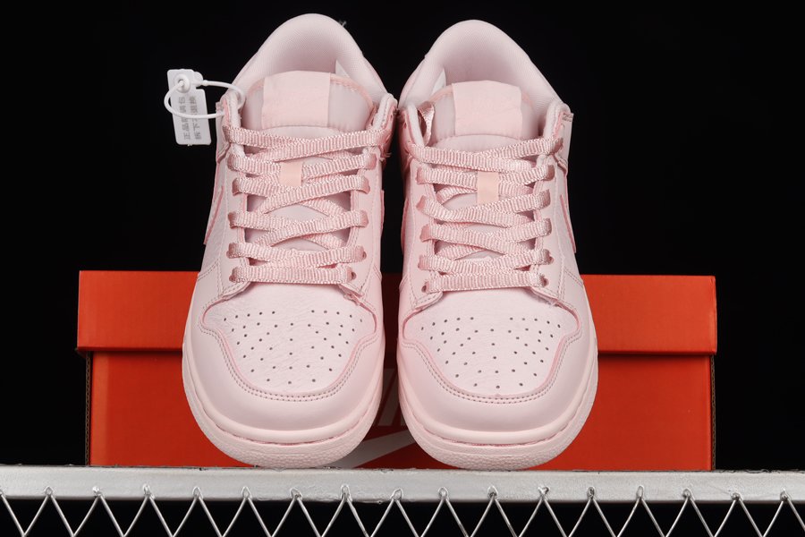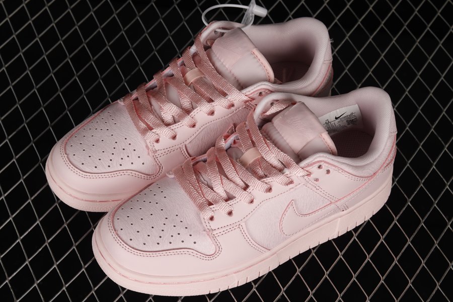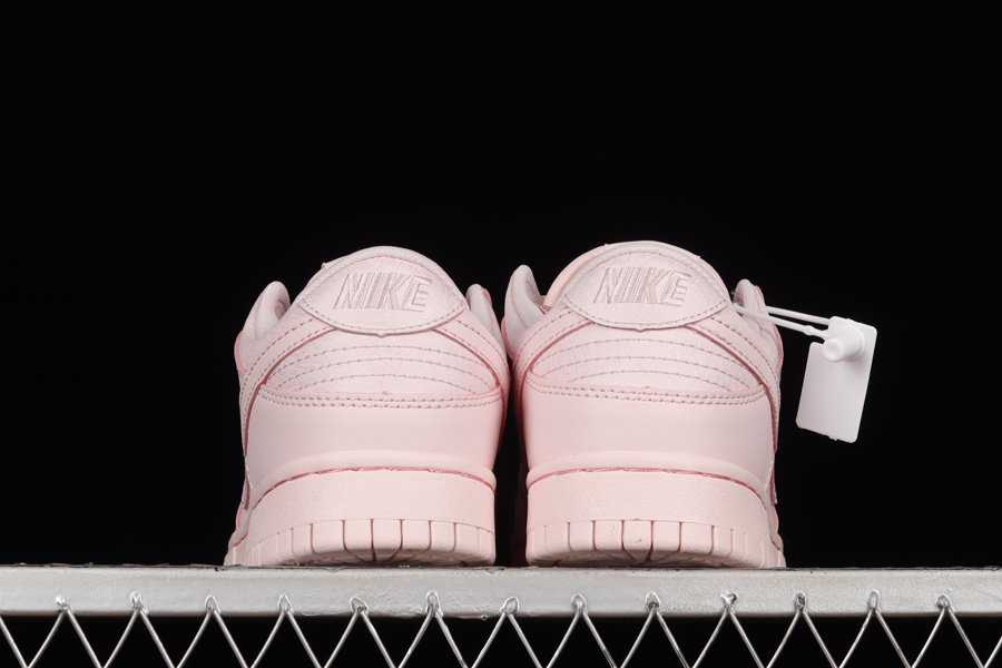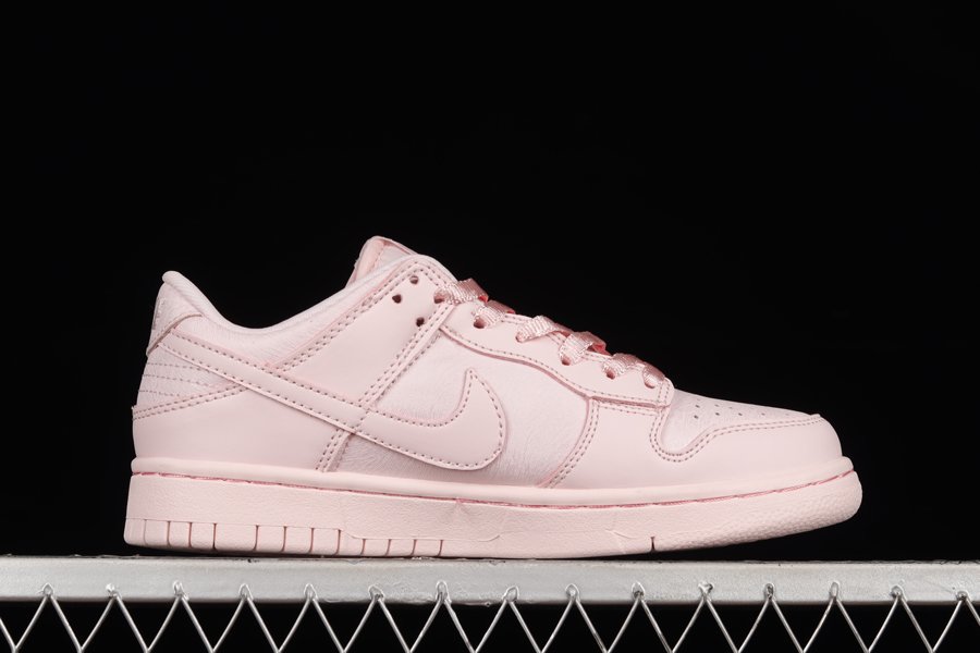 This smaller-sized Dunk Low looks like it has been dipped in baby pink paint from heel to toe. However, what differentiates this shoe from other pink pairs is the unusual texture of the base. This is most likely where the “Prism” in the title of the shoe comes from. The fine pattern seen on the toe box and quarter catches the light and makes the finish of the leather shinier than usual. The rest of the overlays are in plain smooth leather, including the profile Swooshes on both sides of the shoe. An all-baby-pink sole unit rounds out the shoe’s look.
