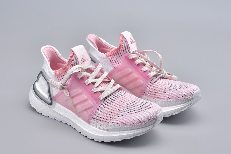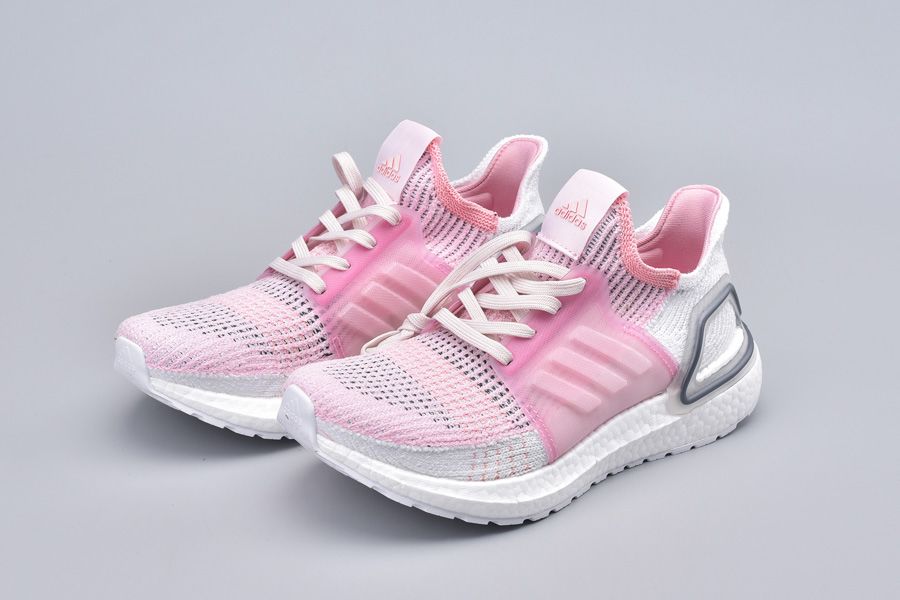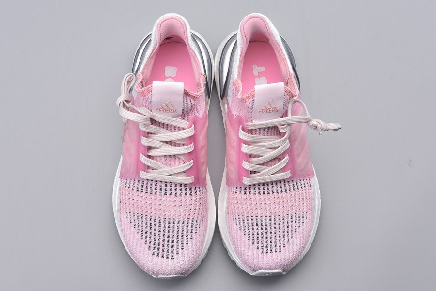Branding sits on the tongue in pale pink while the classic UB silhouette shines through in the adidas Ultra Boost 2019 Pink Womens.