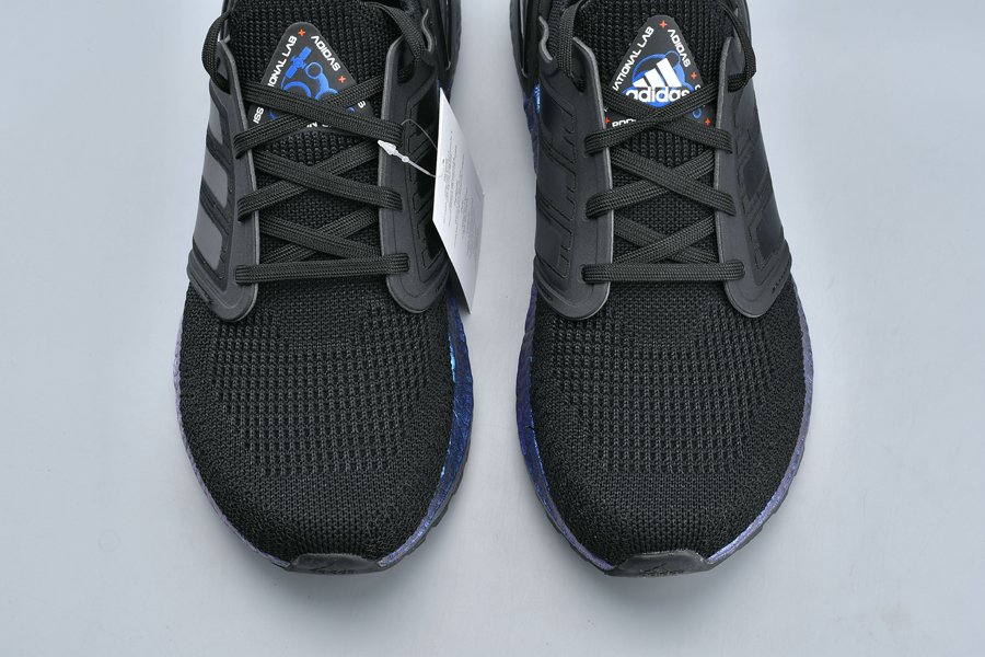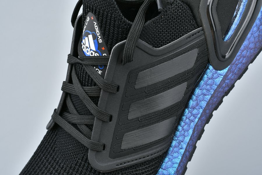 Featured in a sleek black finish, the sneaker looks a bit sleeker compared to its counterparts, while bearing an all-new knitted pattern on the upper. The model is also outfitted with an iridescent/metallic purple Boost midsole atop a black rubber outsole, while finishing touches include branded tongues with the tagline “Boost in Space” which reveals that the model is made in conjunction with the ISS National Lab, a government founded laboratory used for space research to aid in improving life on Earth.