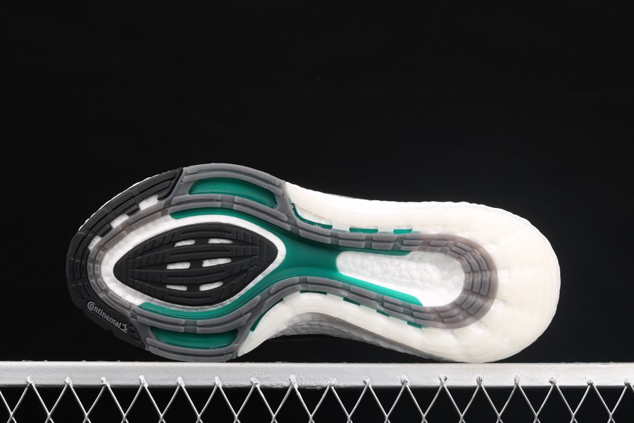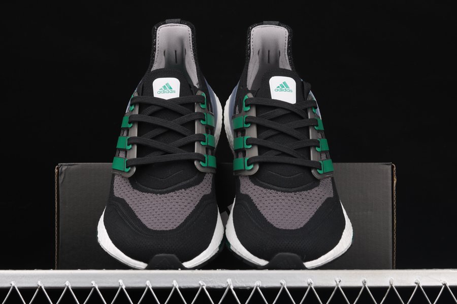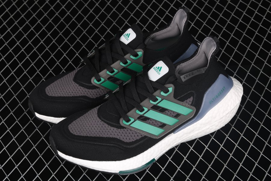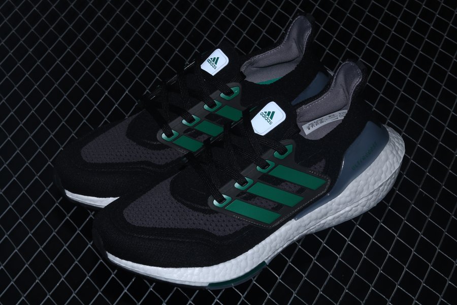 This adidas Ultra Boost 2021 is made with Primeblue, a high-performance recycled material made in part with Parley Ocean Plastic. 50% of the upper is textile, 75% of the textile is Primeblue yarn. Additional details includes Green Three Stripes, Grey toes atop a White Boost midsole and semi-translucent Continental rubber outsole.