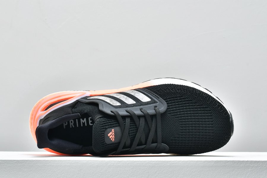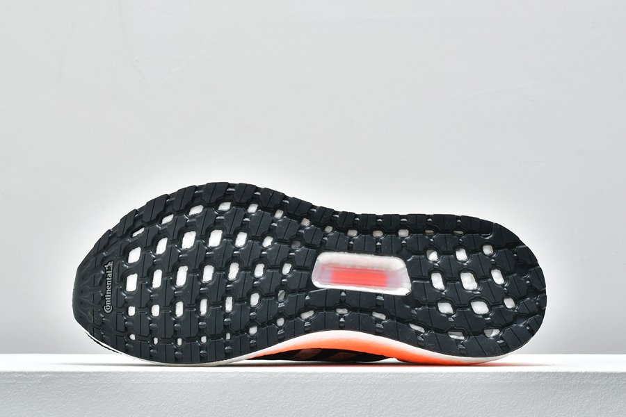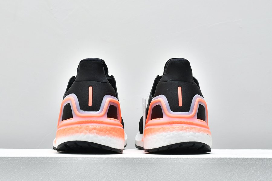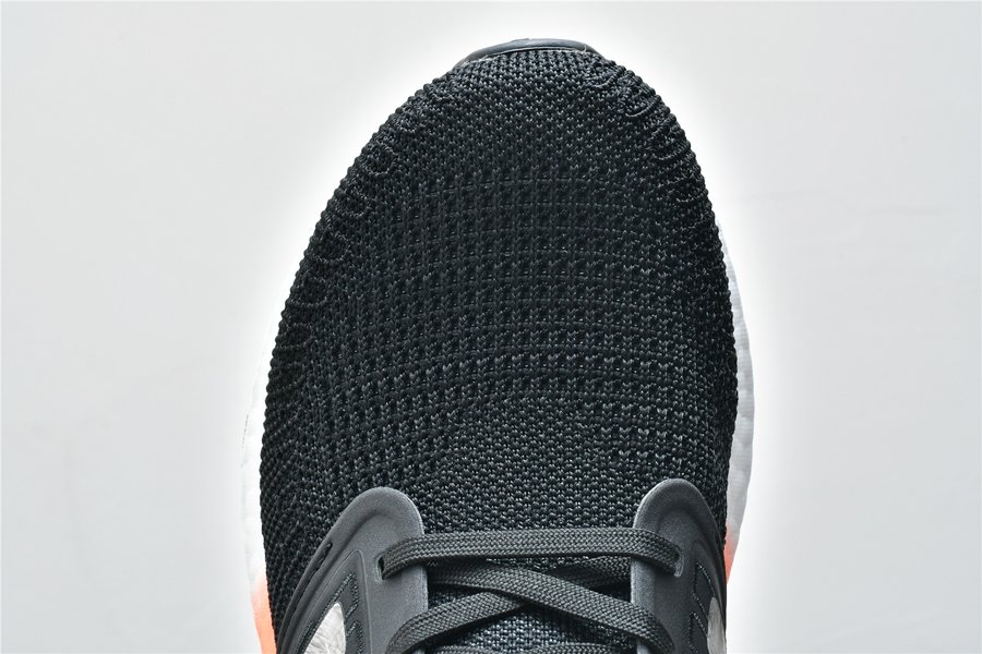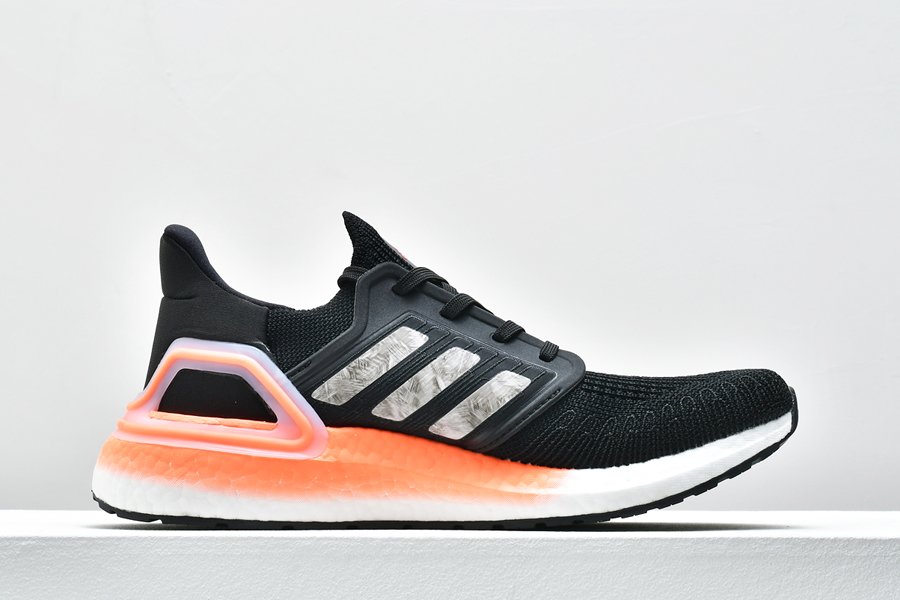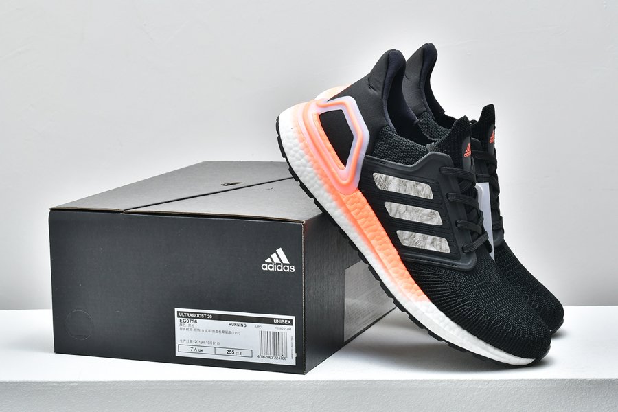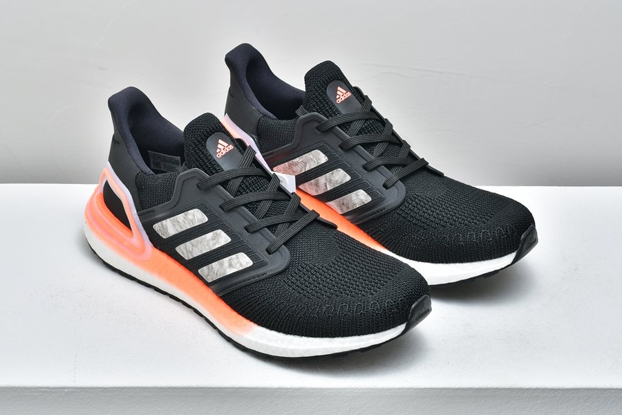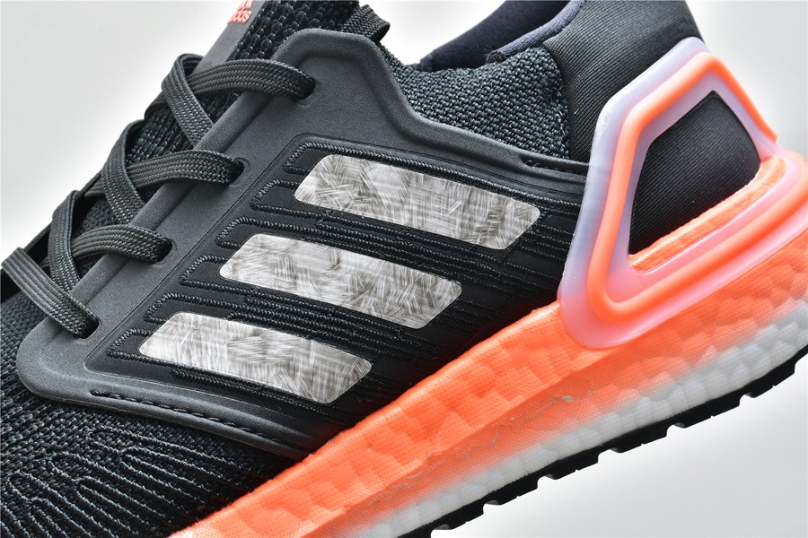 This UltraBoost 20 Core Black Signal Coral features the signature Adidas Primeknit upper along with stitched-in reinforcement that is precisely placed to give you support in the places you need it most.