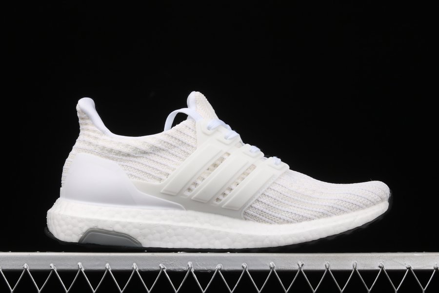 From running the track to running the streets, the adidas UltraBoost is a running shoe that is ready to go the distance. Its lightweight design comes with Boost technology in the midsole for cushioned support. The Primeknit upper makes for a seamless fit, while keeping the foot in breathable comfort. The classic adidas three stripe design is incorporated into the cage and provides a textured contrast to the knit upper. The white colorway ensures a clean, crisp finish.
