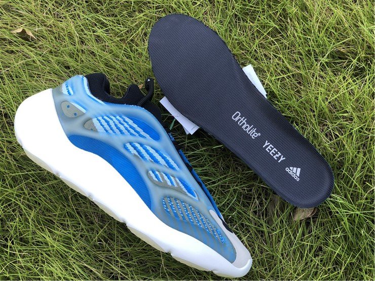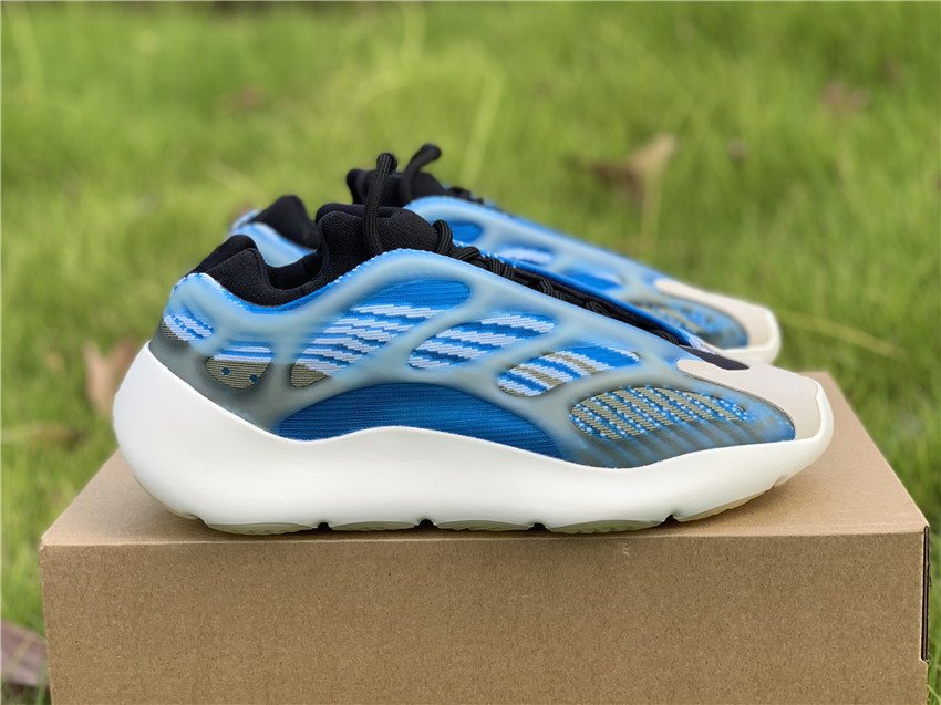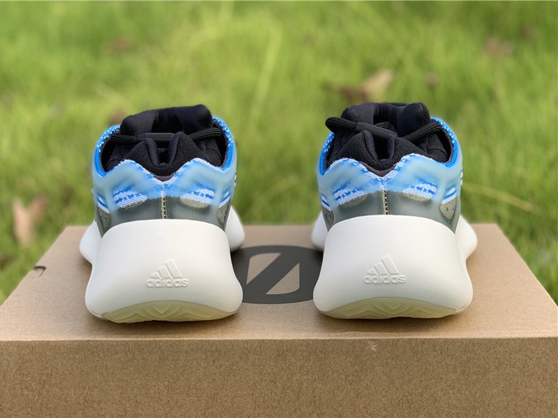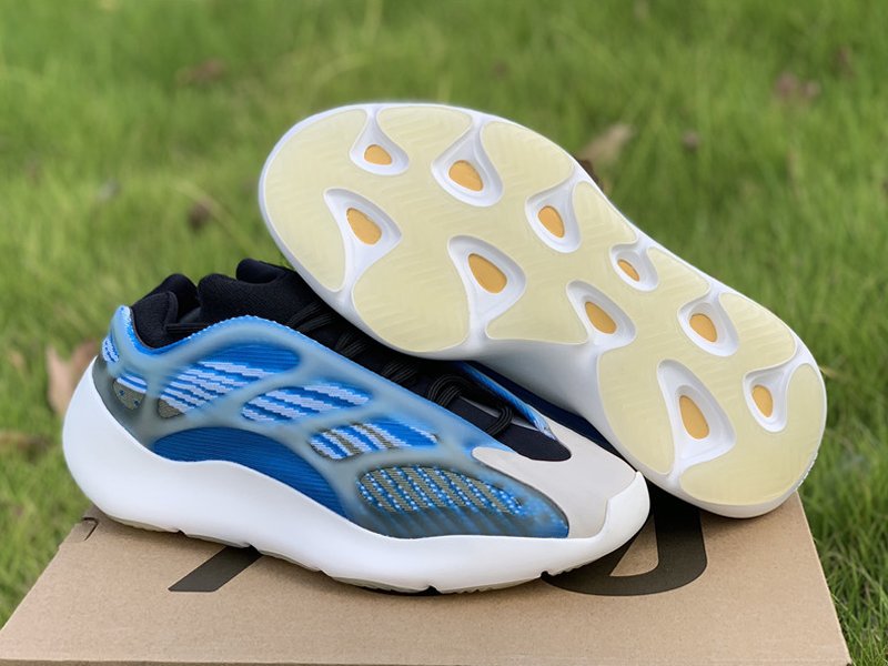 Varying blue tones comprise its Primeknit uppers which are gently contrasted by grey accents. The molded light blue tint translucent cage overlay further defines its aesthetic, while it also glows in the dark. Finally, white rubber soles equipped with an EVA foam tops off the design.