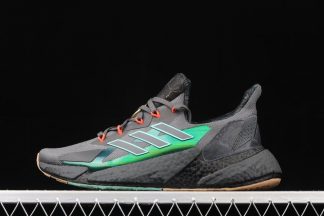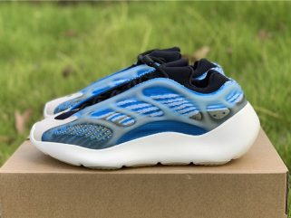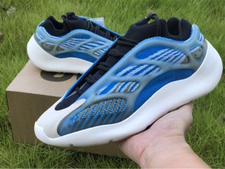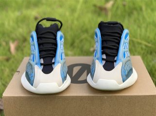 Varying blue tones comprise its Primeknit uppers which are gently contrasted by grey accents. The molded light blue tint translucent cage overlay further defines its aesthetic, while it also glows in the dark. Finally, white rubber soles equipped with an EVA foam tops off the design.